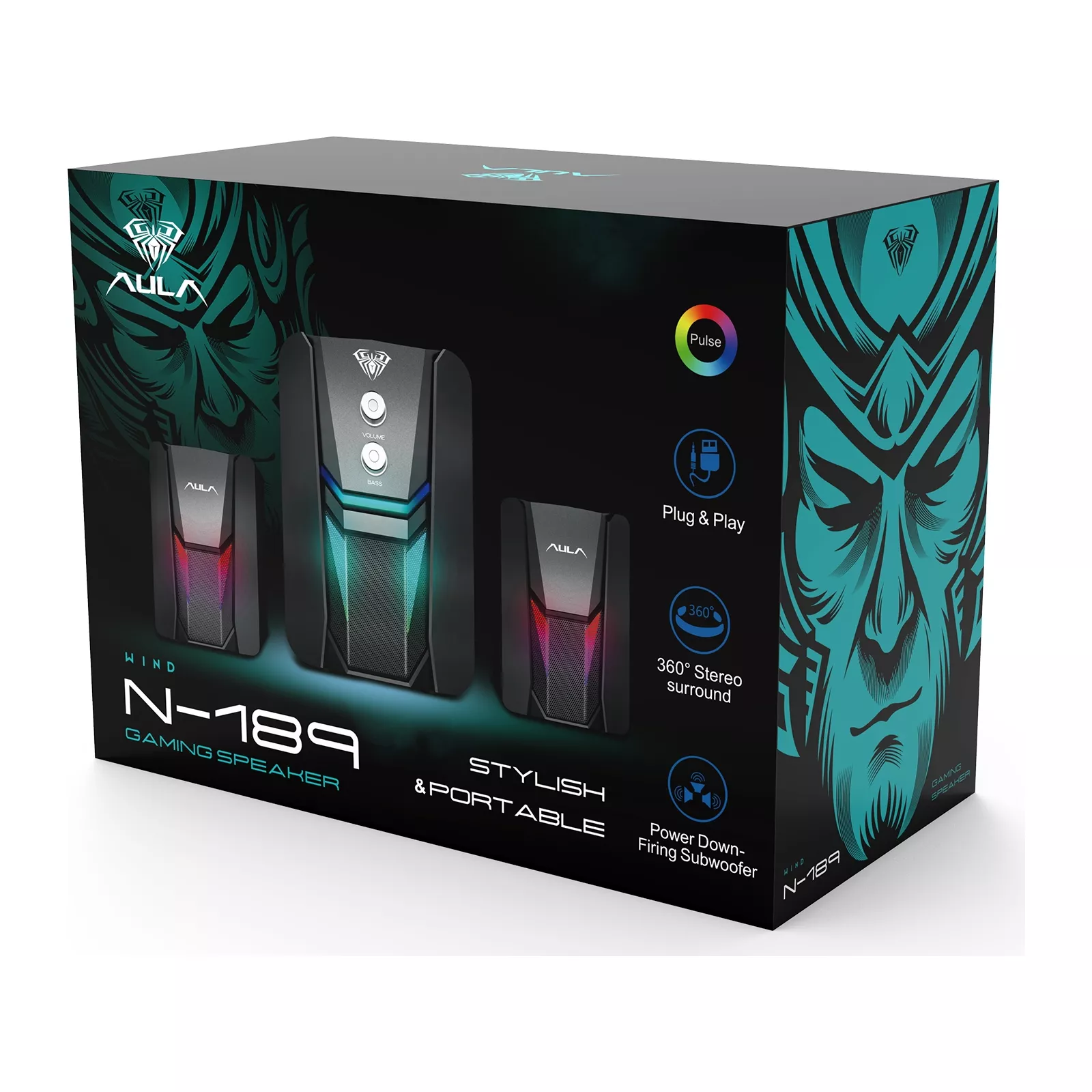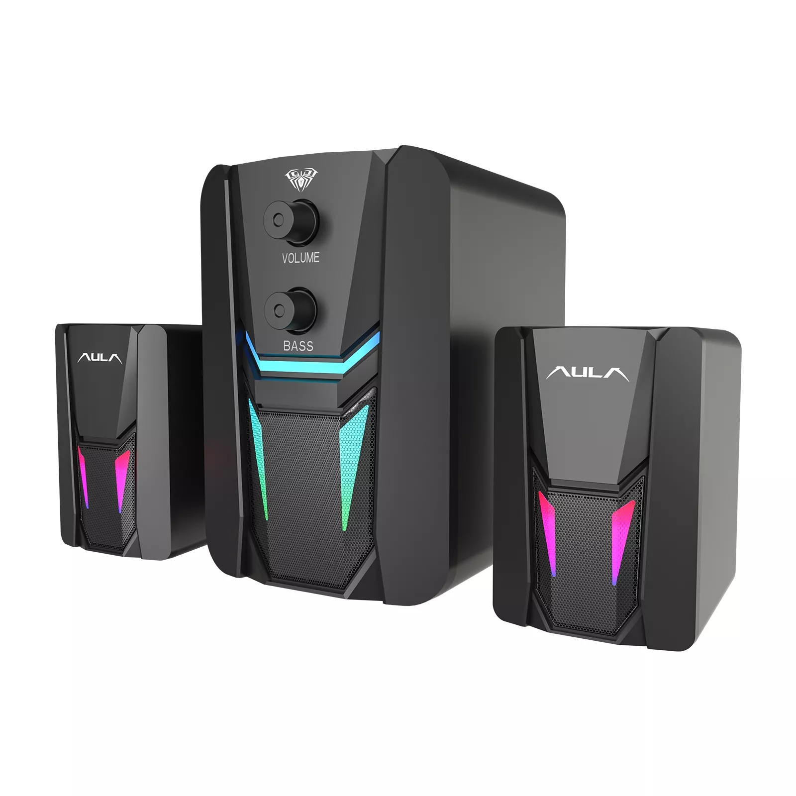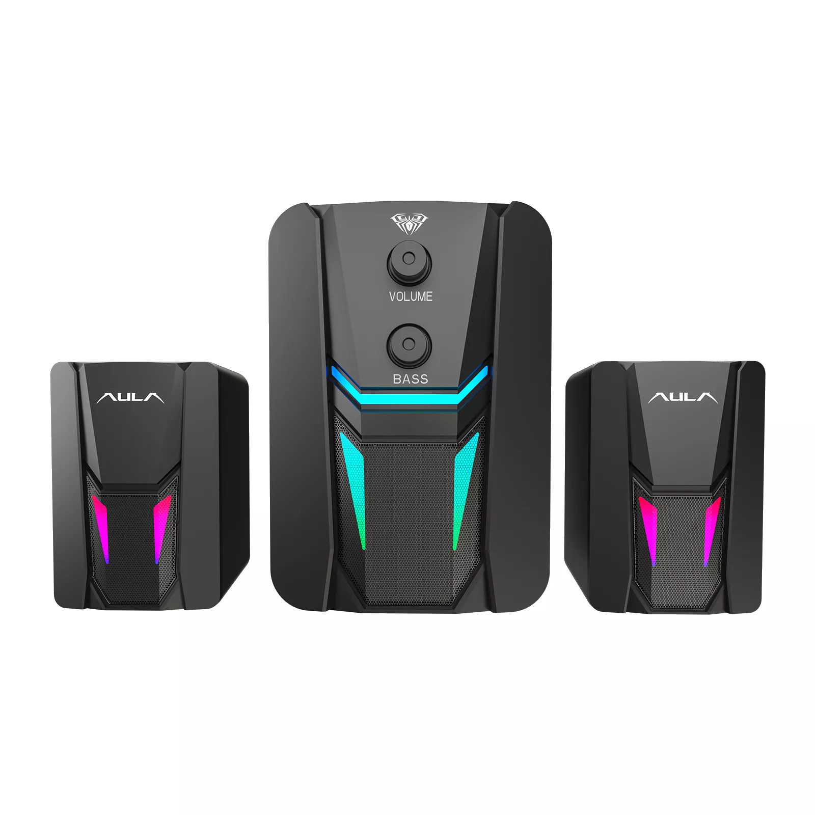 Колонки 2.1 AULA N-189 – это 2.1-канальная акустическая система с двумя динамиками по 3 Вт каждый и активным сабвуфером 5 Вт. Она обеспечивает формирование реалистичного чистого звука с насыщенным воспроизведением низких частот. На корпусе предусмотрены поворотные регуляторы для настройки громкости и баса. Питание подается от порта USB, что позволяет подключить колонки AULA N-189 к ПК и другой совместимой технике. Ножки на основании снижают вибрационную отдачу и предотвращают скольжение. За решеткой расположены интегрированные светодиоды RGB, которые создают эффектное цветовое освещение.