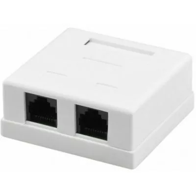 Настенная двухпортовая розетка для наружной проводки. Используется с кабелем категории 5e UTP. Имеется маркировочная табличка для идентификации кабелей. Интерфейс - RJ45