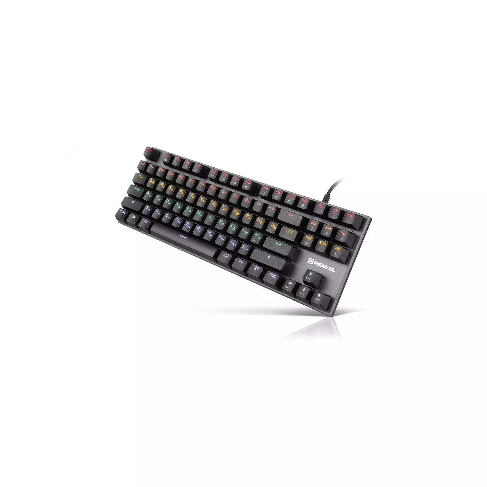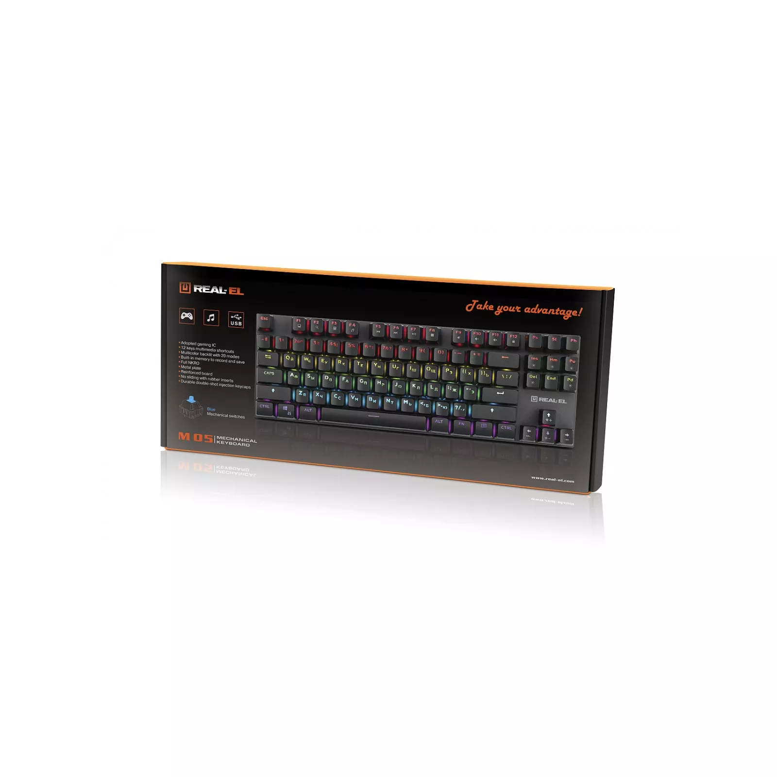 Высокая надежность, быстрое время реагирования, неограниченное количество одновременных нажатий клавиш отличают механическую игровую клавиатуру REAL-EL M 05. Данная модель оборудована разноцветной подсветкой с различными комбинациями, в каждой комбинации по 4 вида подсветки, которые изменяются при повторном нажатии. Всего 20 видов подсветки, позволяющей создать на игровом месте как агрессивную среду для онлайн-шутеров, так и атмосферу сосредоточения и концентрации для квестов и стратегий.