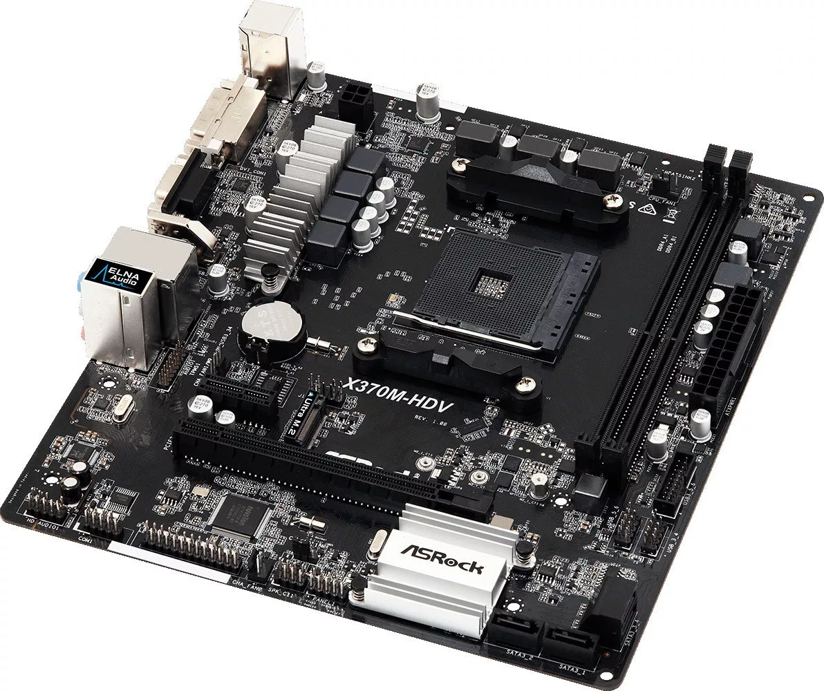 Материнская плата ASRock X370M-HDV Поддерживает процессоры AMD AM4 A-Series APU и процессоры Ryzen, Поддержка DDR4 3200+ (OC) (Ryzen CPU) / 2400 (A-series APU) 1 PCIe 3.0 x16, 1 PCIe 2.0 x1, Устройство графического вывода данных: HDMI, DVI-D, D-Sub, 7.1-канальный HD-кодек (Аудиокодек Realtek ALC887), Аудио-конденсаторы ELNA 4 SATA3, 1 Ultra M.2 (PCIe Gen3 x4 & SATA3) 6 x USB 3.1 Gen1 (2 передних, 4 задних) Realtek Gigabit LAN