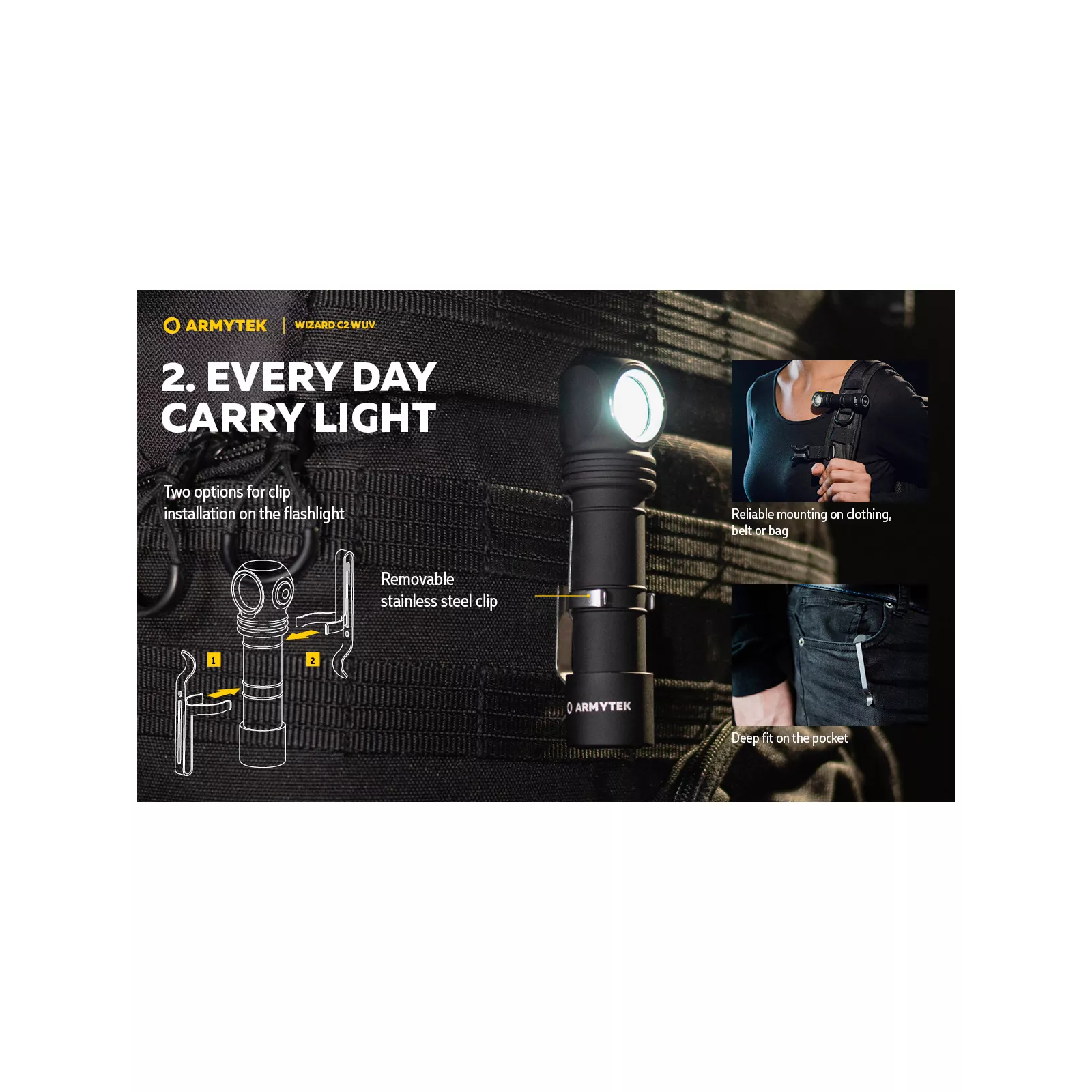 Универсальность Wizard C2 WUV определяется несколькими вариантами фиксации: на голове с помощью надежного оголовья , на любом элементе одежды с помощью стальной клипсы, на любых металлических поверхностях благодаря магниту в колпачке. Модель совместима с оригинальным креплением ABM-01 для установки на велосипед и креплением AHM-02 для строительной каски.