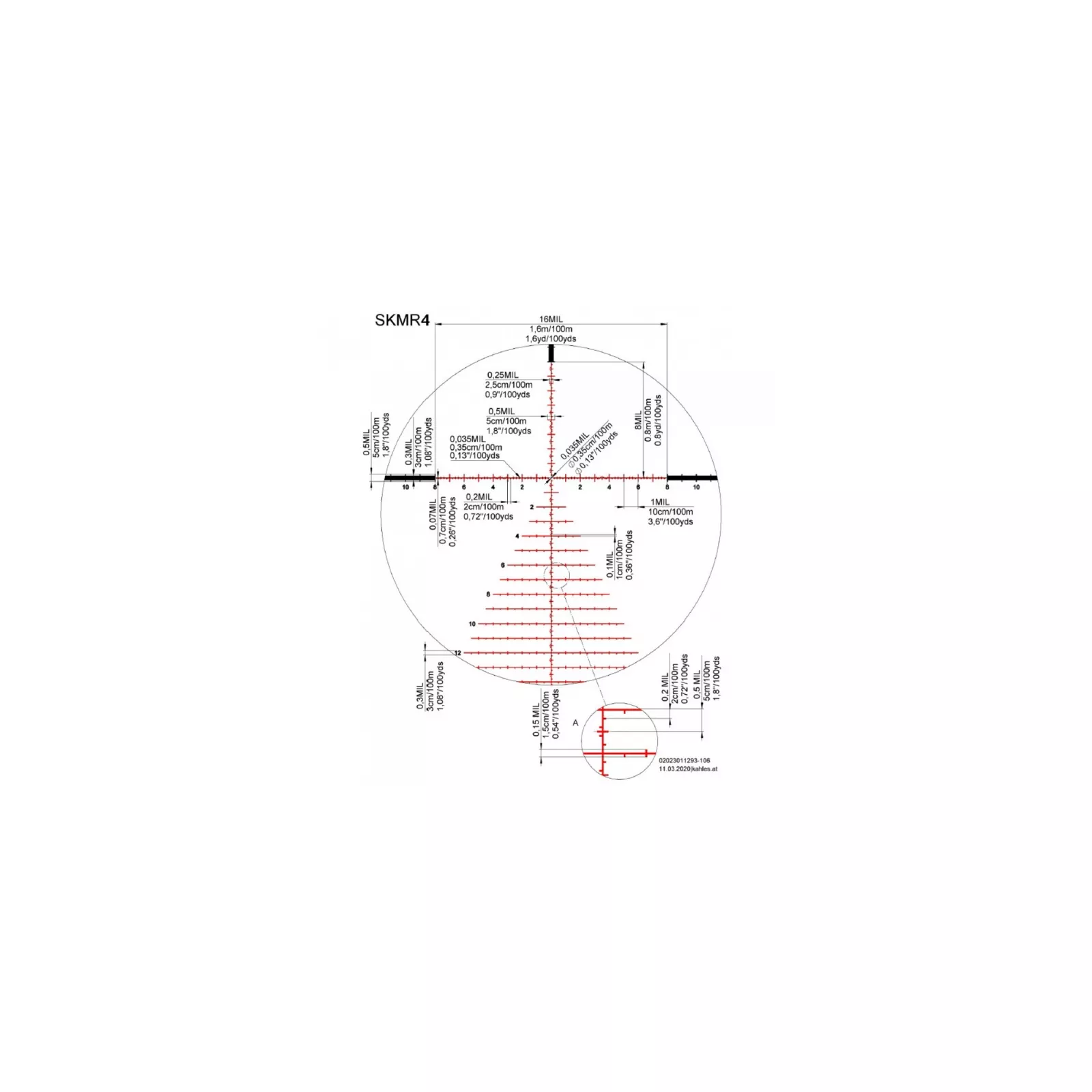 - Количество горизонтальных полос увеличено по сравнению со SKMR3 с 12 до 15 увеличения дальности стрельбы. Расстояние между горизонтальными полосками маркеров поддерживается шагом 0,5 MIL. Метки для поправок на ветер на горизонтальных полосах теперь сплошные, а не пустые для лучшей видимости. Между отметками в 3 MIL и 4 MIL по вертикали и горизонтали в SKMR4 так же как и в SKMR3. Интервалы указаны 0,1 MIL.