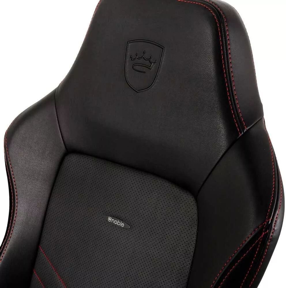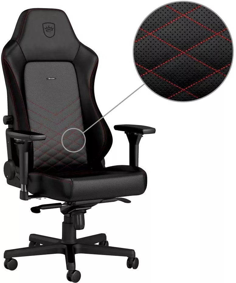 NOBLECHAIRS Hero Series — это эргономичное игровое кресло, которое сияет черной кожей. Для идеальной терморегуляции использован точно перфорированный материал по всей поверхности соприкосновения с телом, а также в поясничной области и на сидении, вишитые ромбы из деликатно выкроеного материала создают крошечные воздушные карманы, что способствует оптимальной вентиляции – даже в разгаре лета.