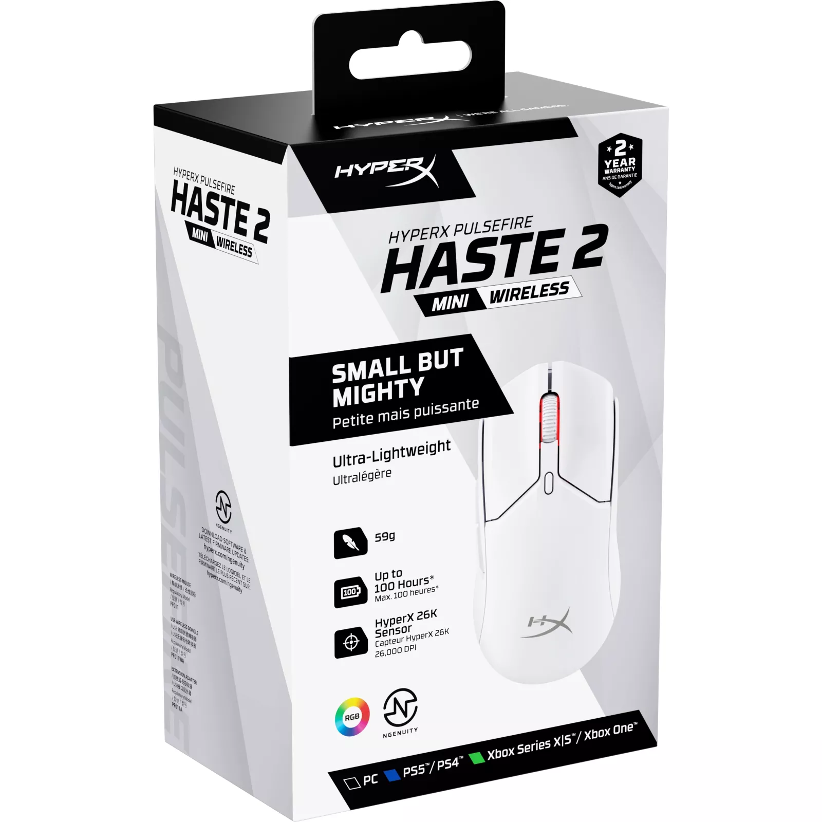 HyperX Pulsefire Haste 2 Mini Wireless — это точная мышь для геймеров, которые хотят иметь сверхлегкую мышь со свободой беспроводной связи, но хотят все это в компактном форм-факторе весом менее 60 граммов. Эта мощная миниатюрная мышь на 16% меньше Pulsefire Haste 2 Wireless, но содержит тот же набор высокопроизводительных специальных компонентов HyperX. Pulsefire Haste 2 Wireless оснащен и укомплектована двухрежимным беспроводным подключением, позволяющим переключаться между беспроводным соединением 2,4 ГГц и Bluetooth, а также зарядным кабелем USB-C – USB-A, позволяющим пользоваться мышью в проводном режиме во время зарядки. Безупречный датчик (индикатор) HyperX 26K, имеющий собственное разрешение до 26 000 точек на дюйм со скоростью отслеживания до 650 IPS (16,5 м/с). Наши специальные переключатели HyperX обеспечивают тактильный звуковой отзыв о каждом удачном нажатии и рассчитаны на срок службы до 100 миллионов нажатий. Вы также наслаждаетесь отличным физическим контролем над мышью благодаря накладкам, входящим в комплект и гладким глайдам с низким коэффициентом трения. Получите максимальную отдачу каждого движения мыши с помощью программного обеспечения HyperX NGENUITY, которое позволяет создавать макросы для 6 программируемых кнопок, настраивать параметры DPI и персонализировать RGB подсветки.