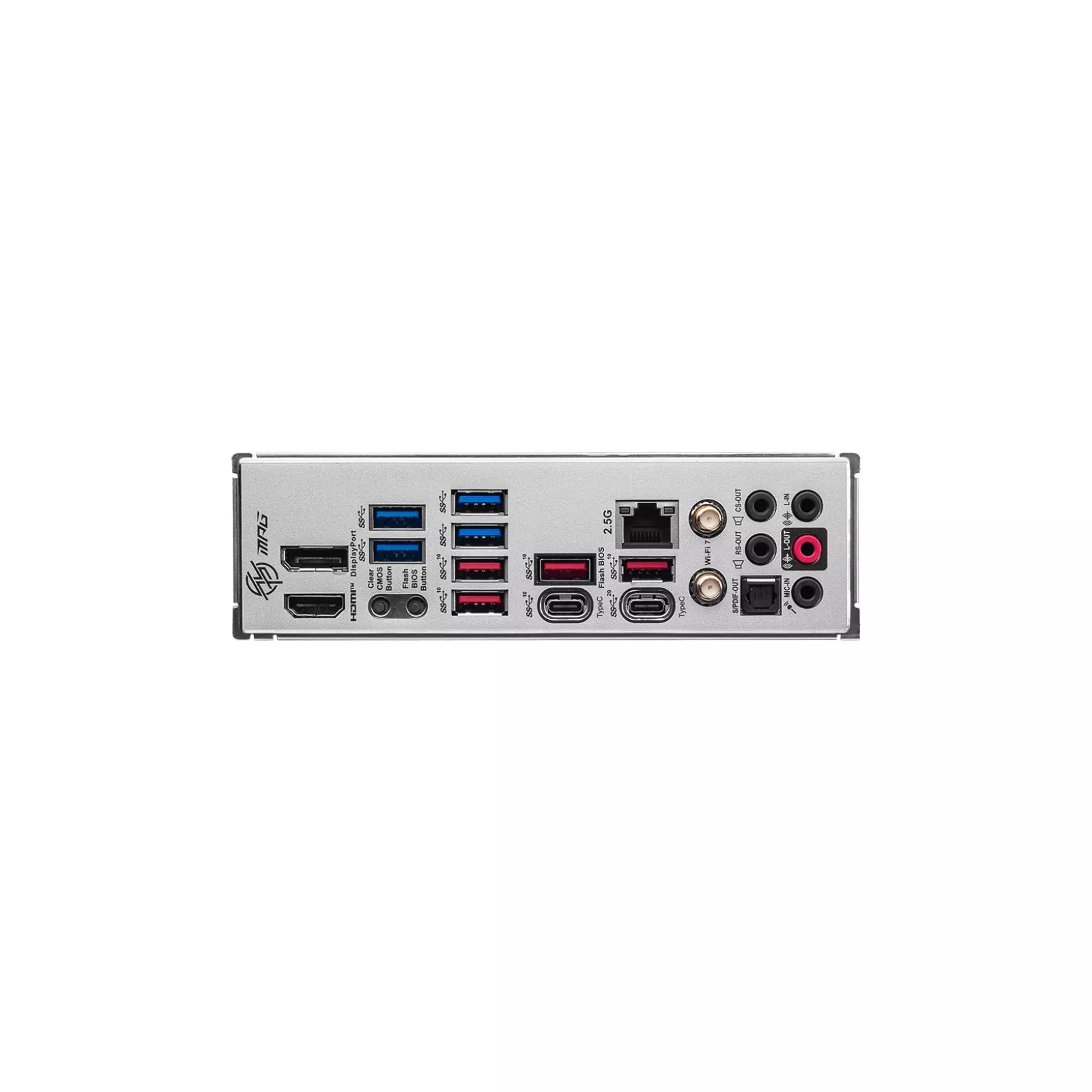 Наружные порты | 1 x DisplayPort, 1 x HDMI, 1 x RJ45, 1 x USB 3.2 Gen 2x2 Type-C, 1 x кнопка очистки CMOS, 1 x кнопка прошивки BIOS, 1 x оптический выход SPDIF, 1 х USB 3.2 Gen2 Type-C, 4 x USB 3.2 Gen 1 Type-A, 4 x USB 3.2 Gen2 Type-A, 5 x аудио, Антенна Wi-Fi / Bluetooth |