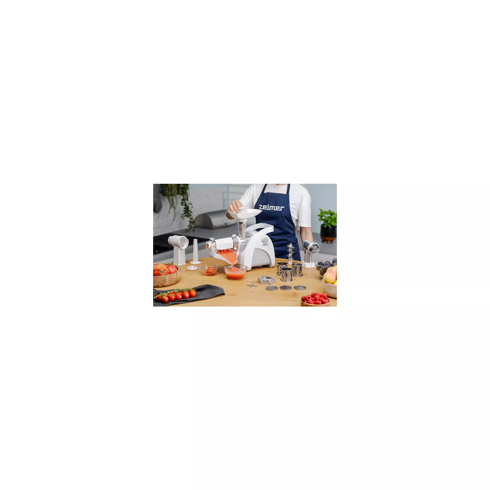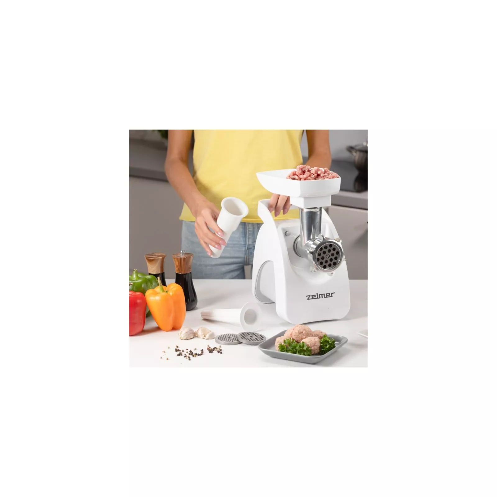 Мясорубка Zelmer ZMM9803B – обязательно в вашей кухне. оснащен и укомплектована двигателем мощностью 2200 Вт, что позволяет измельчать мясо со скоростью 3 кг/мин. Мы вставили ручку в корпус, что упрощает ее переноску. Мясорубка имеет функцию реверса и разнообразные аксессуары: двусторонний нож, слайсер с набором 4 режущих барабанов, насадка для колбас, 3 ситечка. Машина идеально подходит для домашнего использования, а благодаря разнообразию аксессуаров ее функциональность значительно расширяется.