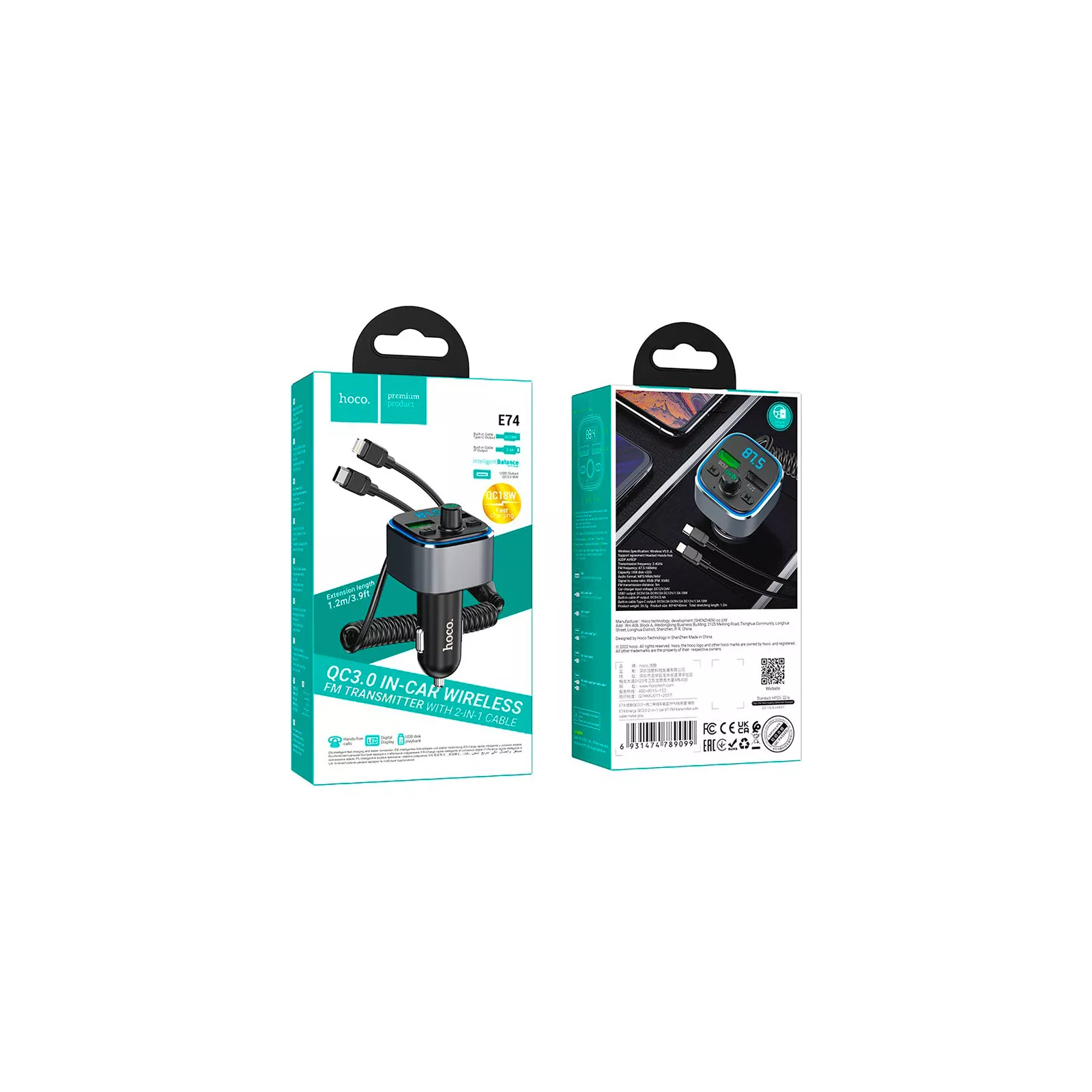 Адаптер автомобильный Hoco Energy with Lightning / Type -C Cable car BT FM transmitter E74 | 2USB, 3A/18W, QC | - это устройство, которое может быть очень полезно для водителя. С помощью этого адаптера можно заряжать свои устройства, слушать музыку и передавать сигналы через Bluetooth 5.0 на чипе Jerry JL.