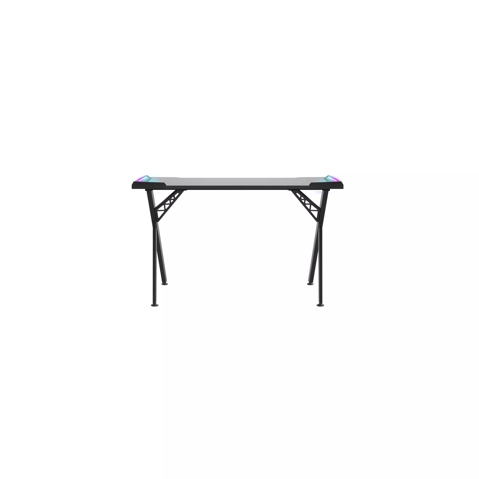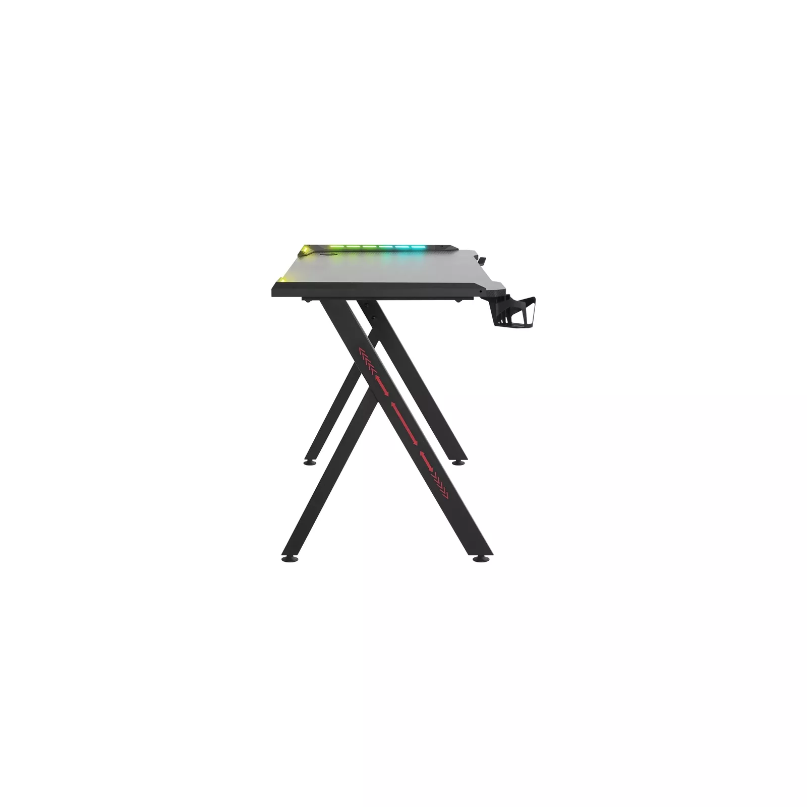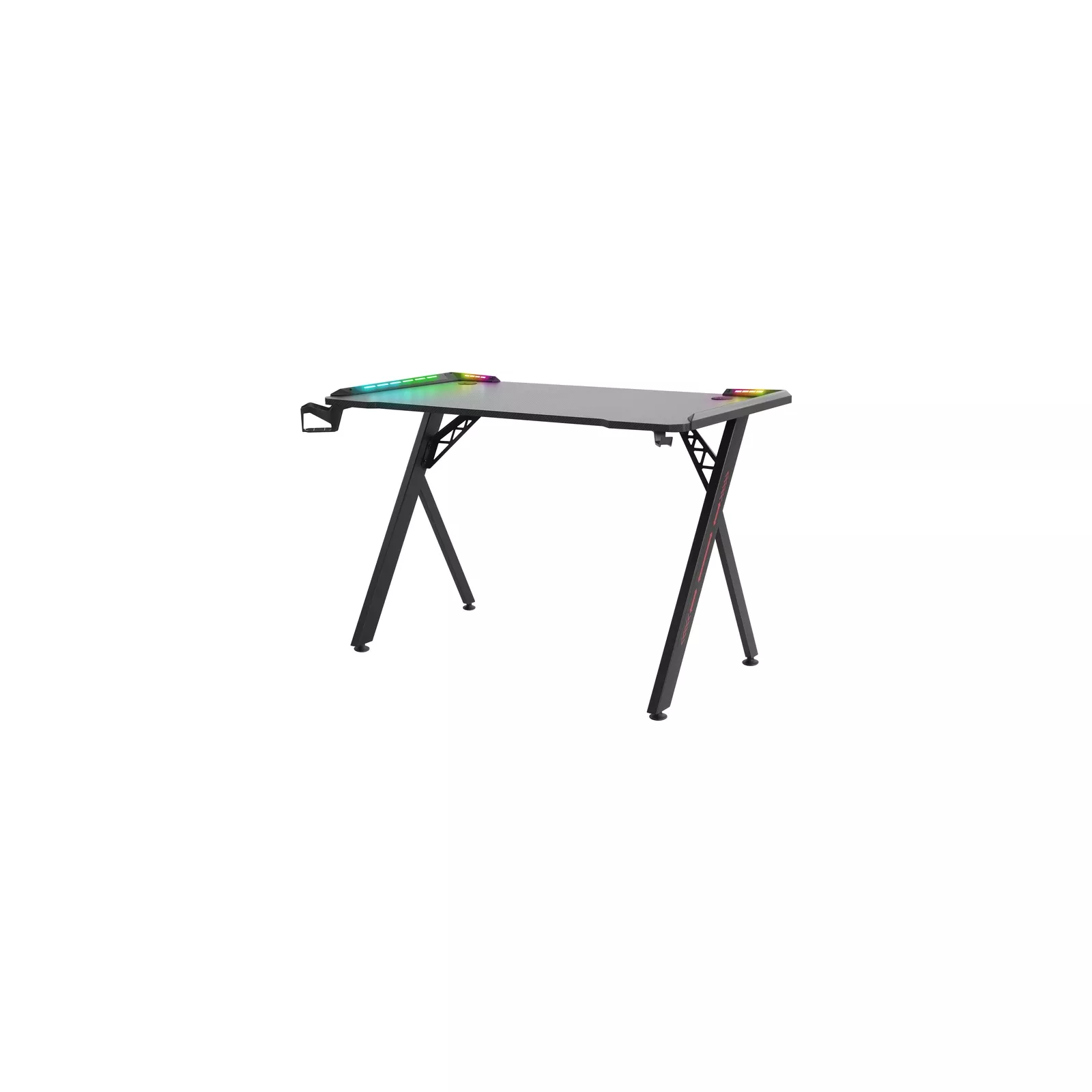 Стильный игровой стол с подсветкой RGB. Столешница покрыта крепкой виниловой пленкой с текстурой "под карбон". Стол комплектуется подставкой для кружки и крючком для гарнитуры.