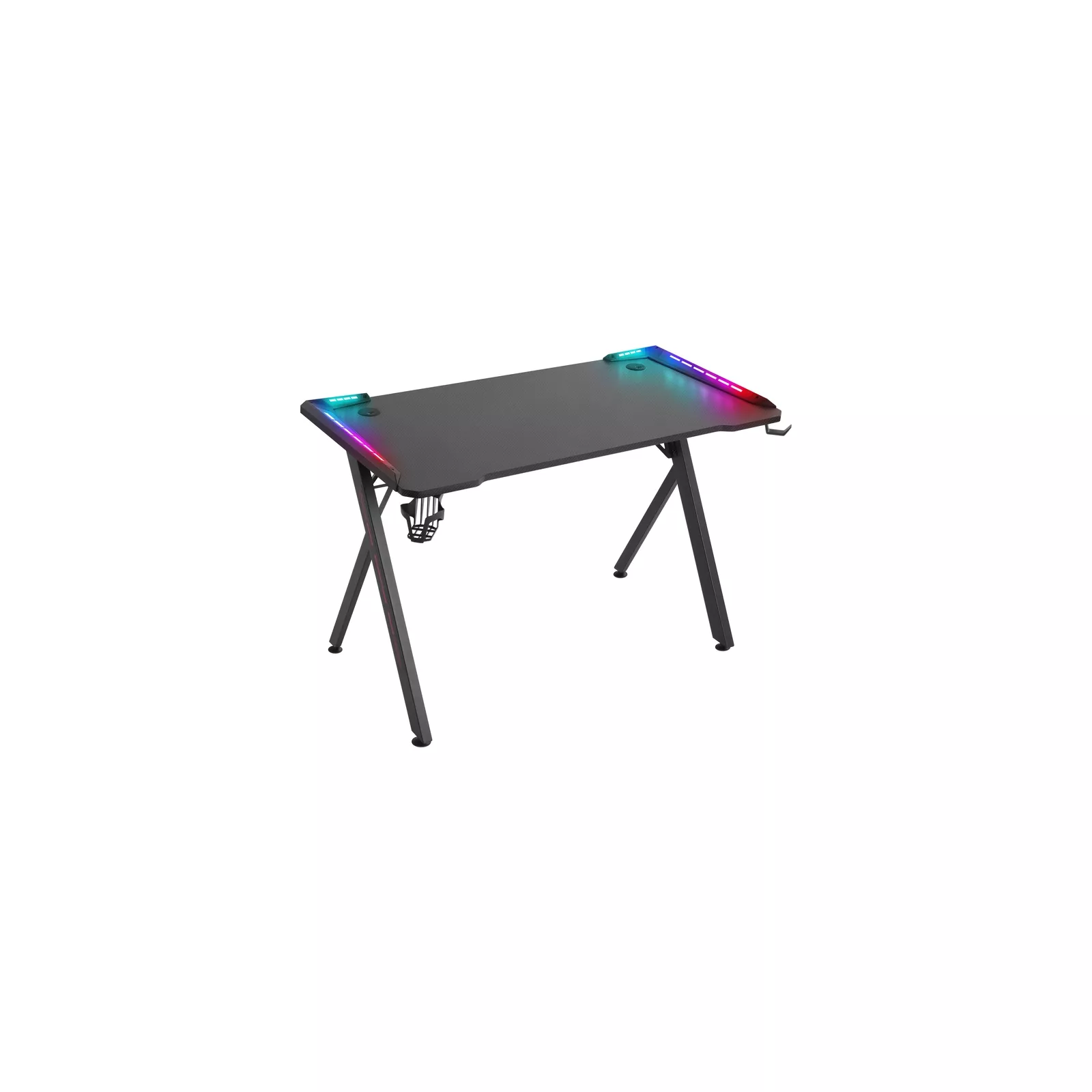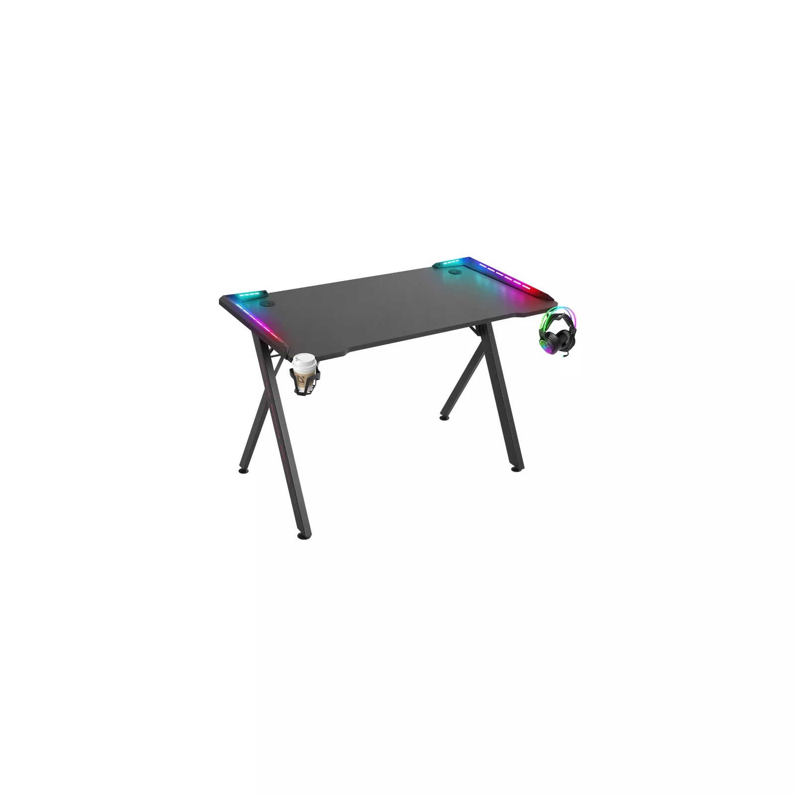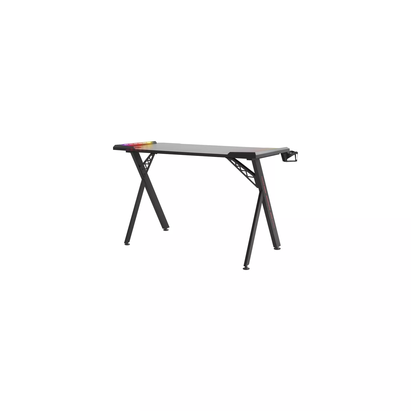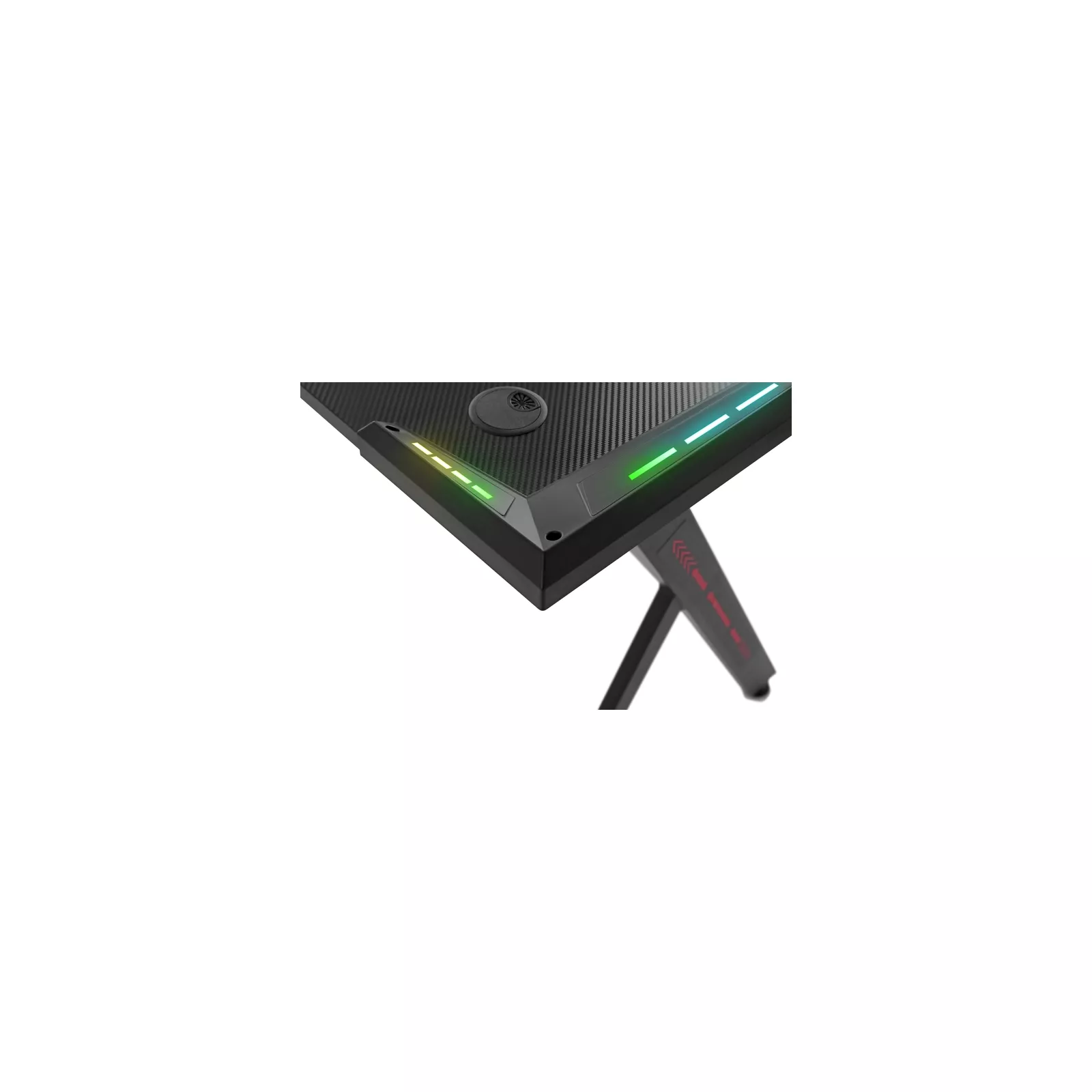 Стильный игровой стол с подсветкой RGB. Столешница покрыта крепкой виниловой пленкой с текстурой "под карбон". Стол комплектуется подставкой для кружки и крючком для гарнитуры.