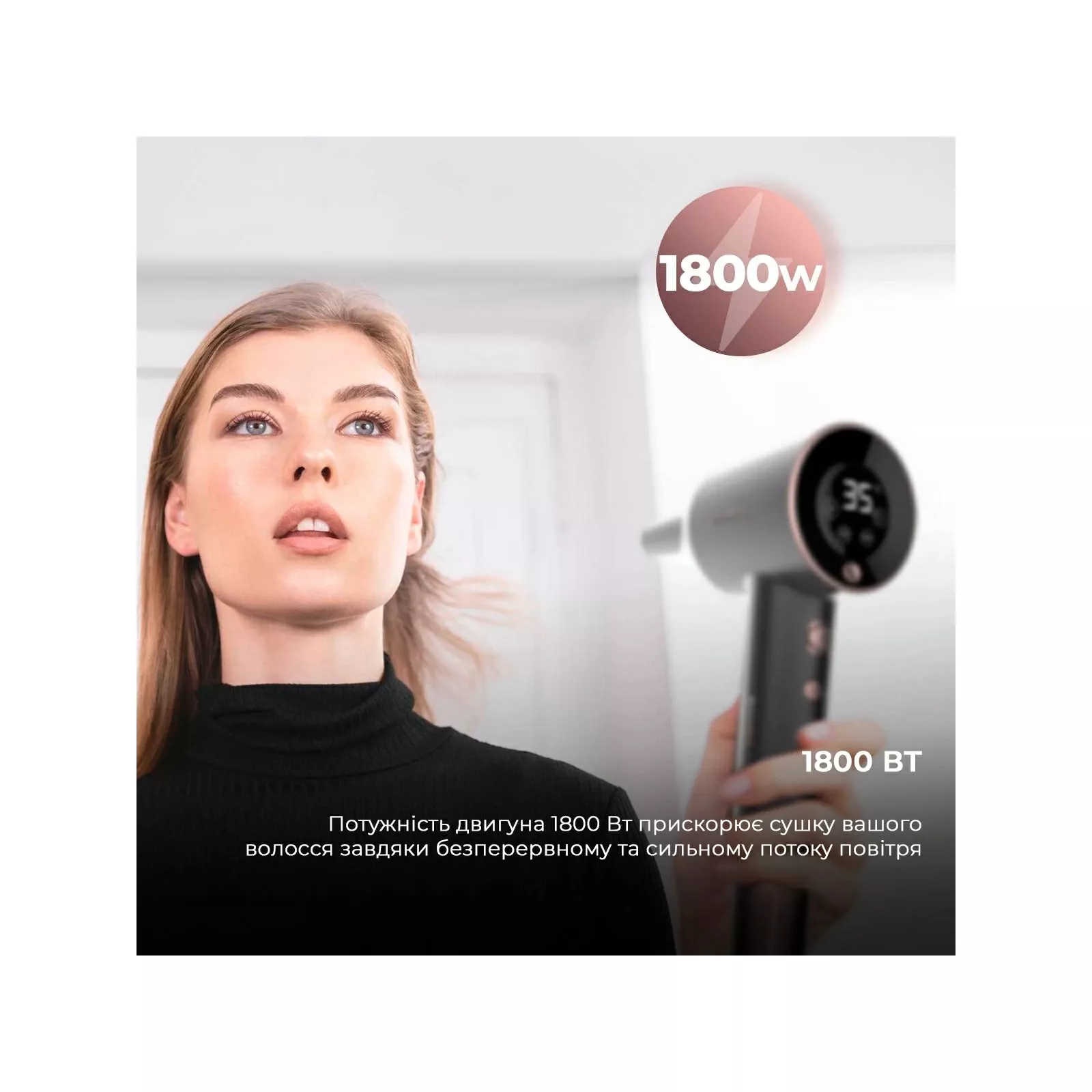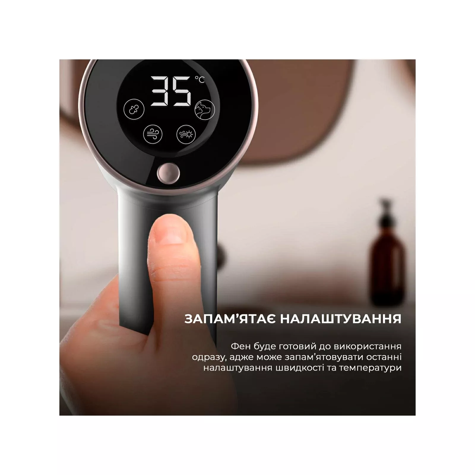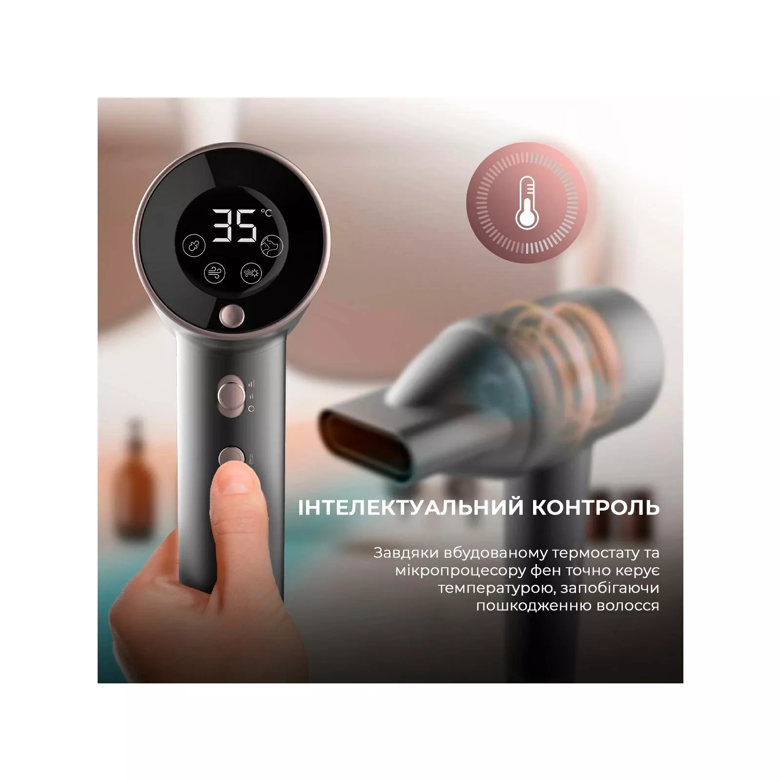Корпус фена имеет удобную конструкцию, центр тяжести расположен в рукоятке для более удобного манипулирования и управления. Для подключения к сети 230 Вольт используется встроенный кабель питания. На задней панели установлен дисплей, сенсорная панель, световое кольцо с индикацией. На ручке есть кнопка включения, переключатель скорости, кнопка для быстрой смены температурных режимов. На нижней части рукоятки есть снимаемая решетка, которая защищает внутренние компоненты от попадания посторонних предметов внутрь корпуса.