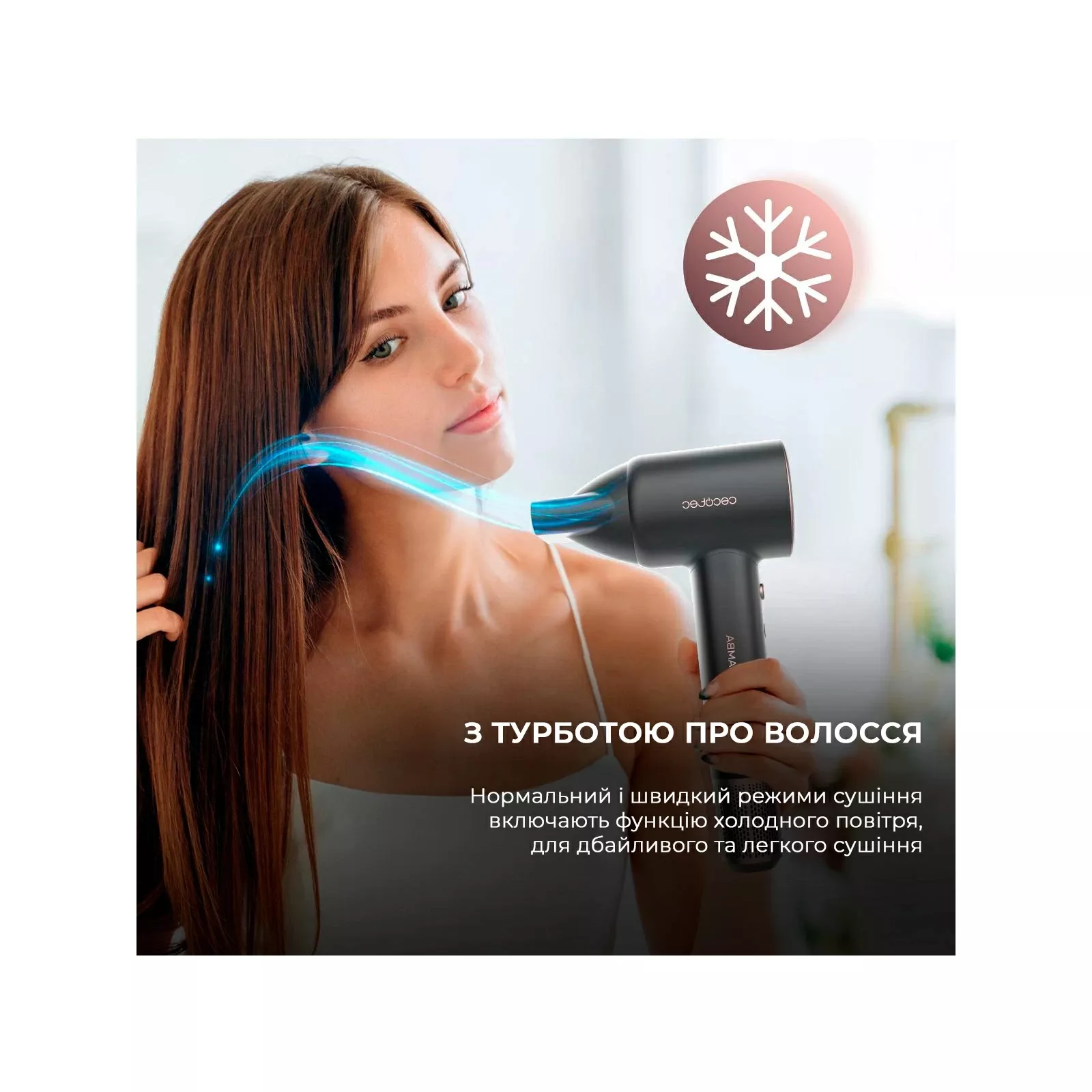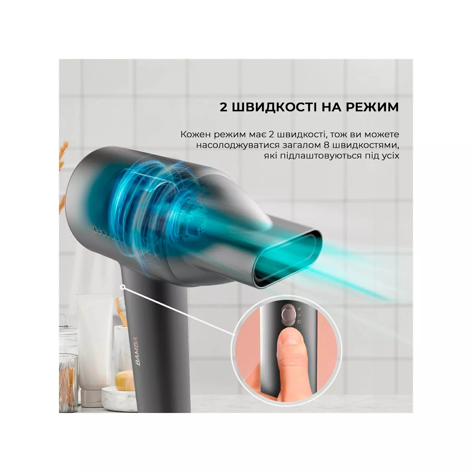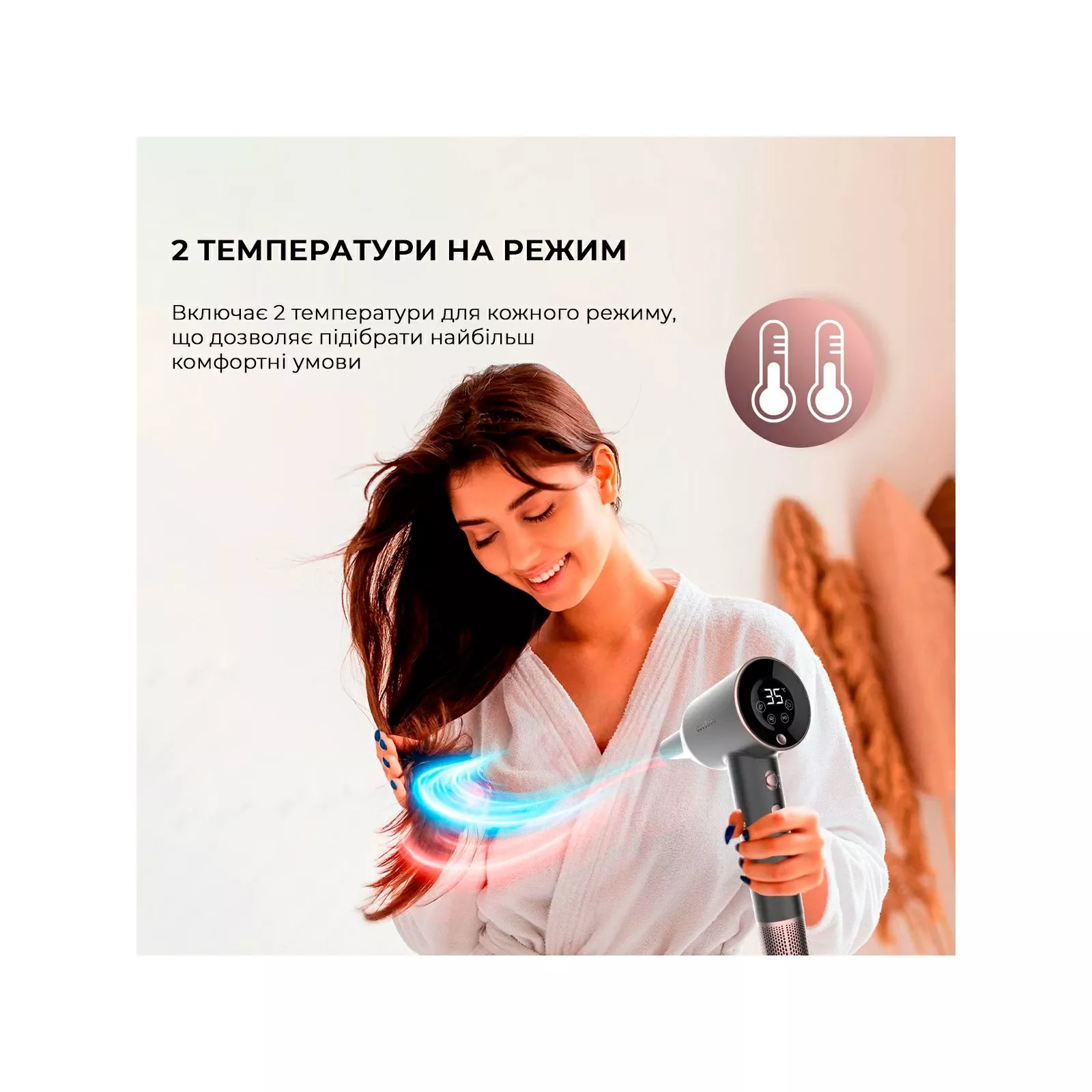 С помощью сенсорного переключателя вы можете выбрать один из четырех установленных режимов, предусматривающий температуру воздуха. Каждый из режимов имеет пару установленных температур, благодаря чему вы можете более гибко выбрать необходимые и соответствующие параметры. В корпус фена CECOTEC Bamba IoniCare Rockstar AirSonic производитель разместил цифровой дисплей, постоянно отражающий температуру воздушного потока. Также вокруг дисплея и сенсорной панели есть индикаторное световое кольцо, которое сигнализирует о текущей температуре воздуха: