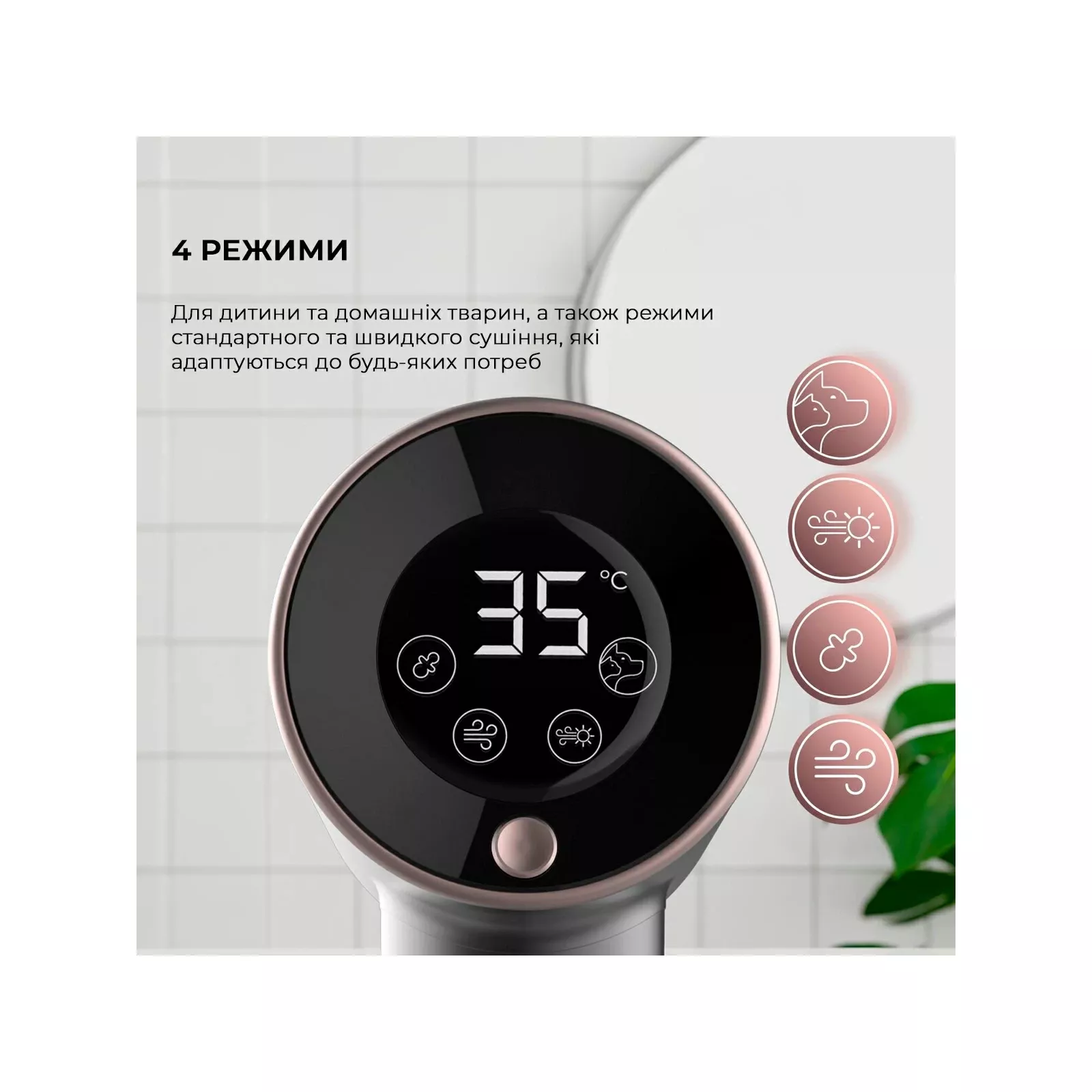 В корпусе фена установлена сенсорная панель, на которой расположены четыре сенсорные клавиши. С помощью этих переключателей можно выбрать один из режимов сушки: режим детского сушки, нормальный режим, режим быстрого высушивания, режим сушки домашних животных. Переключение режимов можно осуществлять непосредственно во время работы устройства.