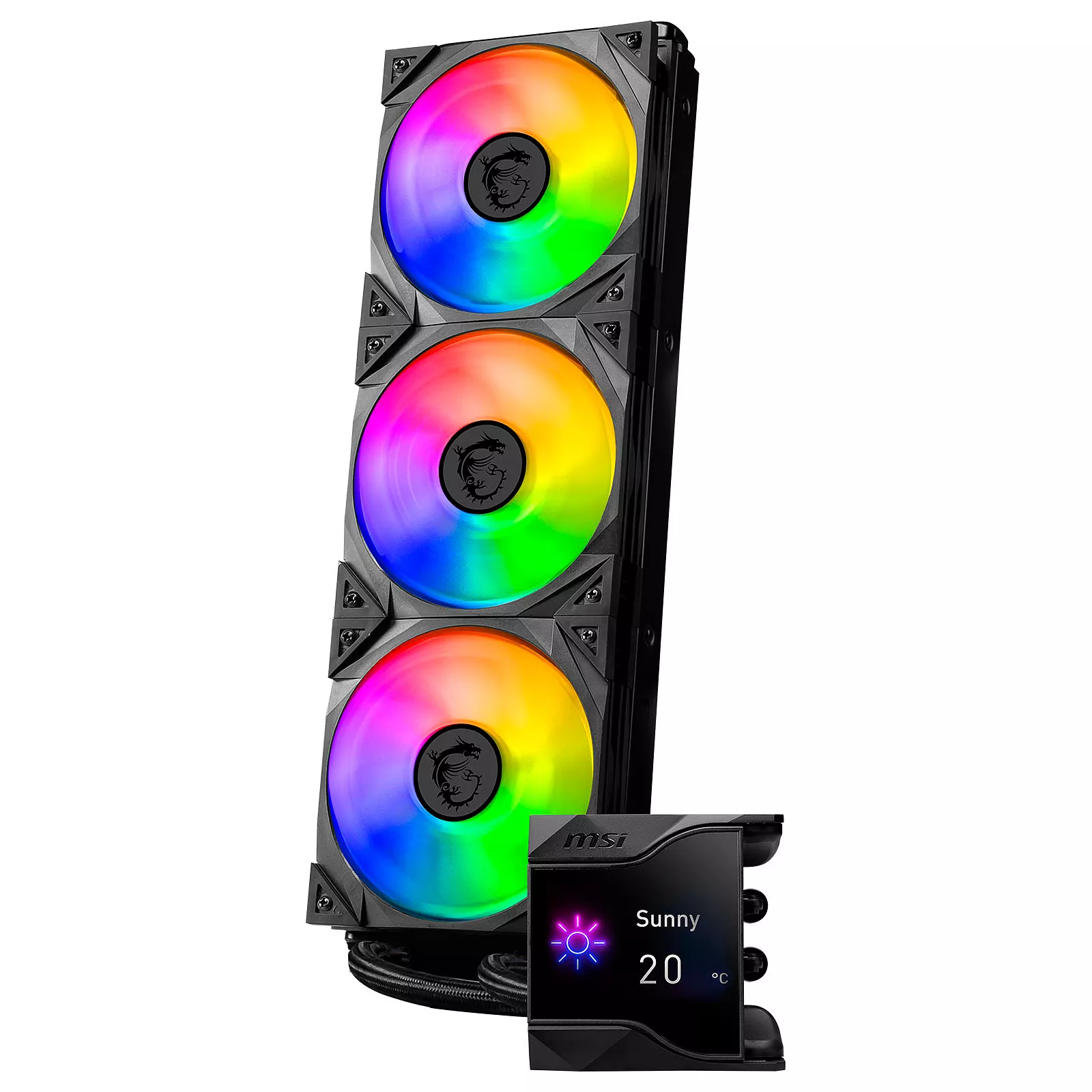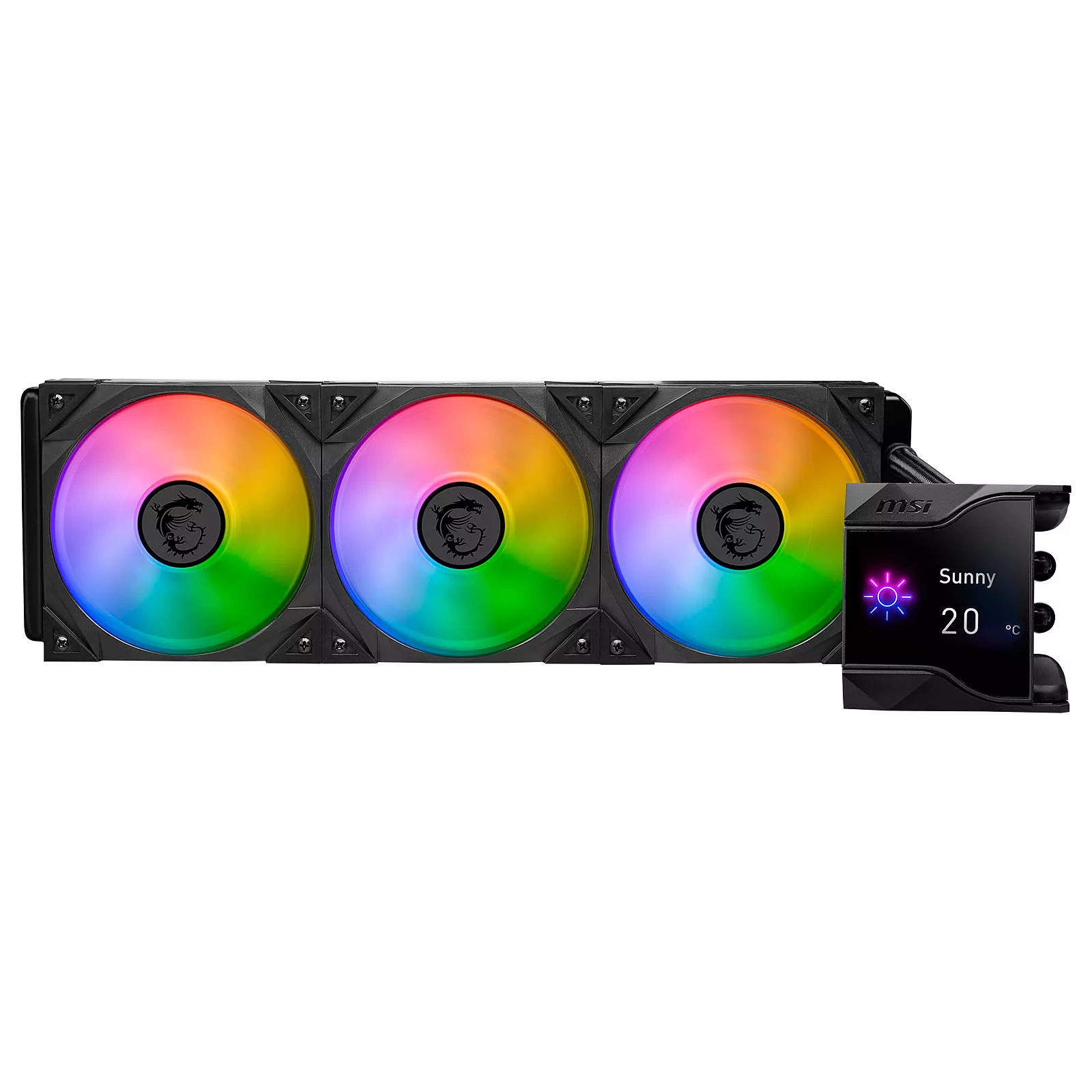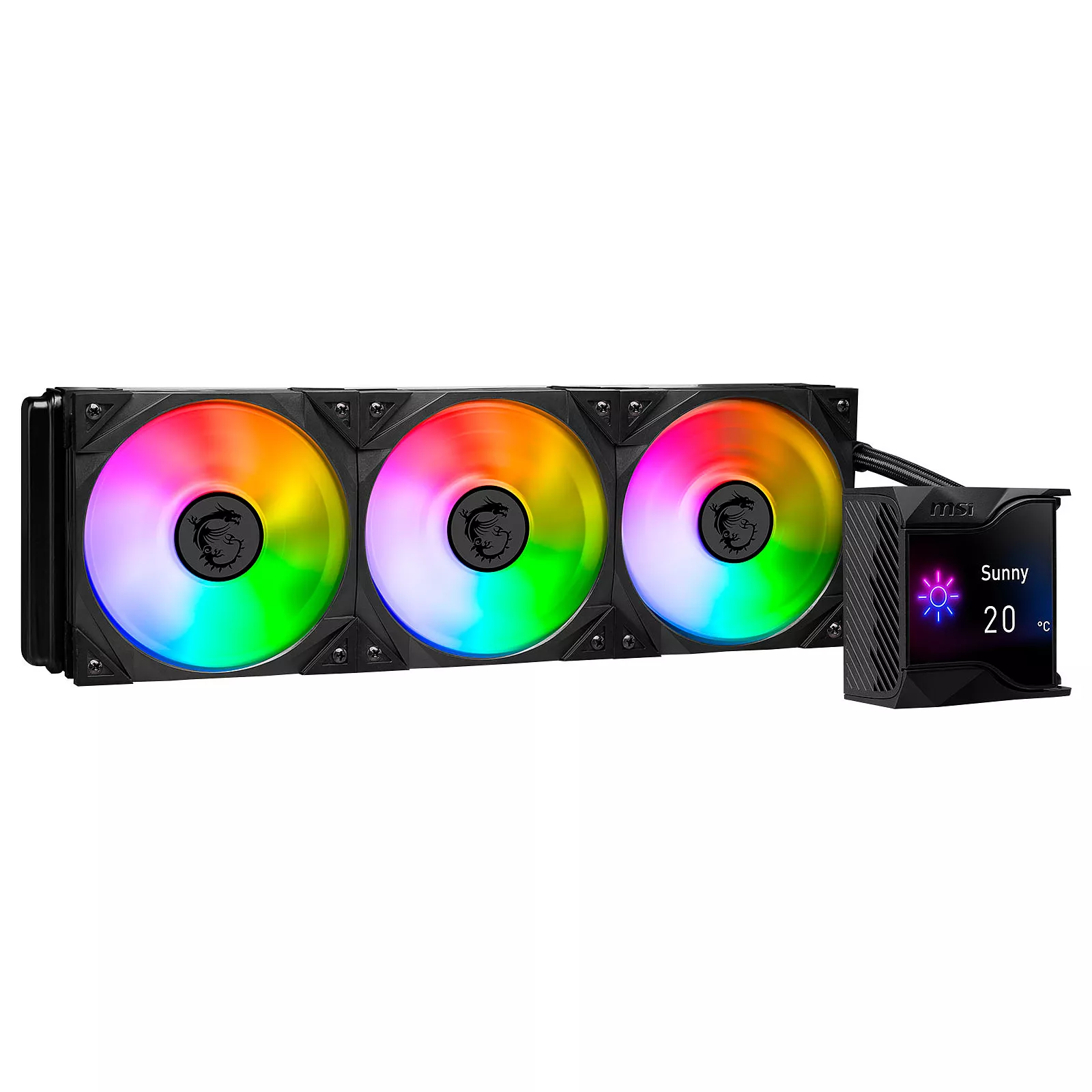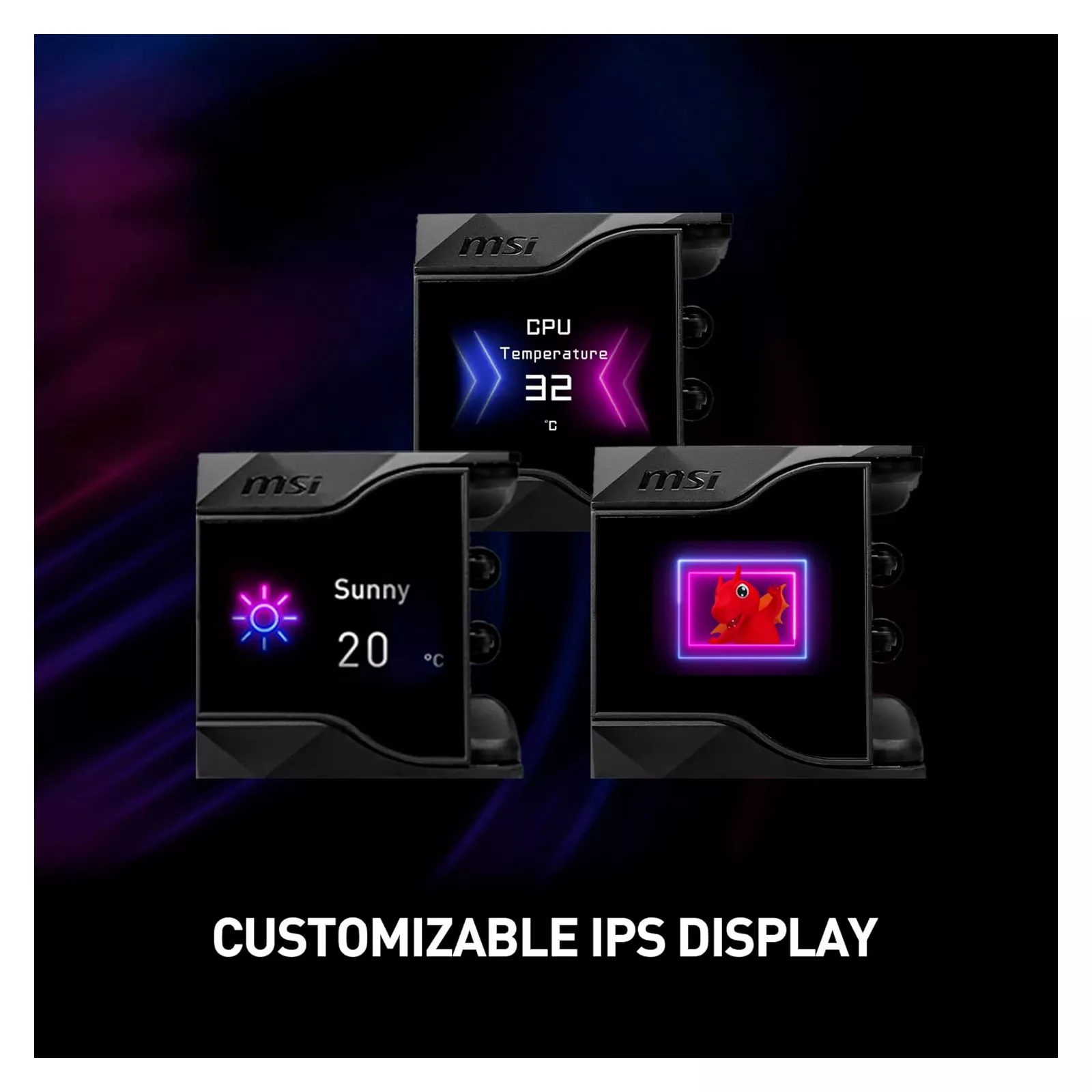 2,4 дюймовый IPS-дисплейСерия систем жидкостного охлаждения MPG CoreLiquid D AIO оснащен и укомплектована 2,4-дюймовым IPS-дисплеем, способным отображать информацию о состоянии системы, GIF, MP4, фотографии, тексты и информацию о погоде в реальном времени.