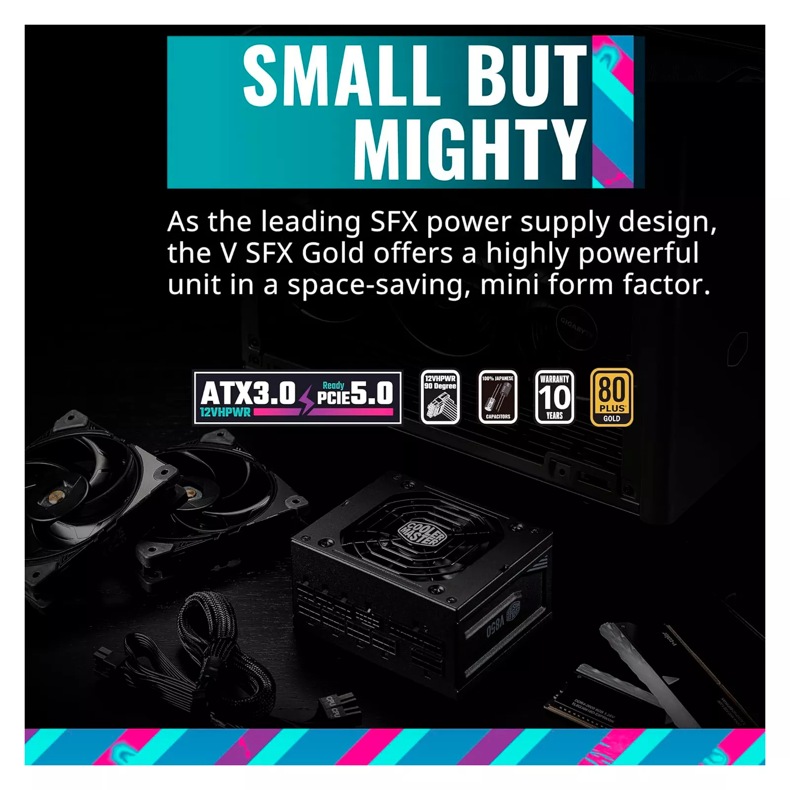 Как ведущий блок питания SFX, V SFX Gold предлагает мощный блок в миниатюрном форм-факторе, что экономит место.