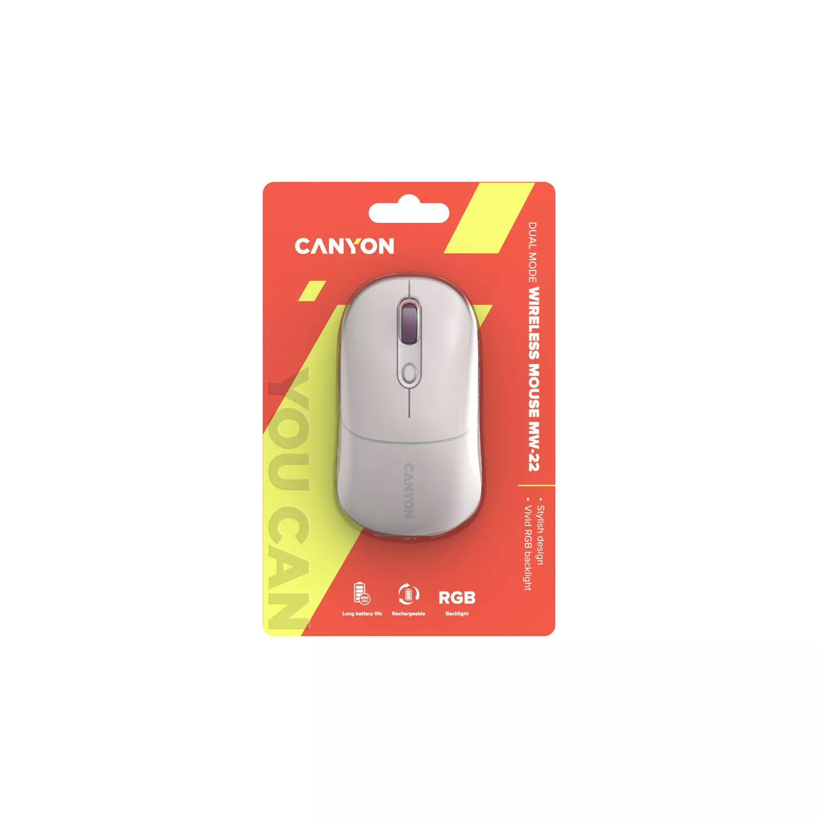 Canyon MW-22 — компактная мышь с множеством козырей в рукаве. Это двухрежимная беспроводная связь: вы можете подключить ее через USB-ключ Bluetooth 5.0 или 2.4 ГГц, поэтому выберите соединение, которое отвечает вашим потребностям. Под капотом у нас есть оптический датчик (индикатор) с регулируемой настройкой разрешения до 1600. Аккумулятор перезаряжается и имеет достаточно длительный срок службы благодаря своей емкости 650 мАч и разумному режиму энергосбережения. Также имеется подсветка RGB, где вы можете выбирать между пятнадцатью режимами или отключить ее полностью, чтобы получить более длительное время использования. Если пора подзарядиться, мышь предлагает порт для зарядки типа C, а также кабель длиной 80 см, входящий в комплект. Четыре кнопки гарантированно выдержат не менее трех миллионов нажатий, поэтому сможете нажимать вволю.