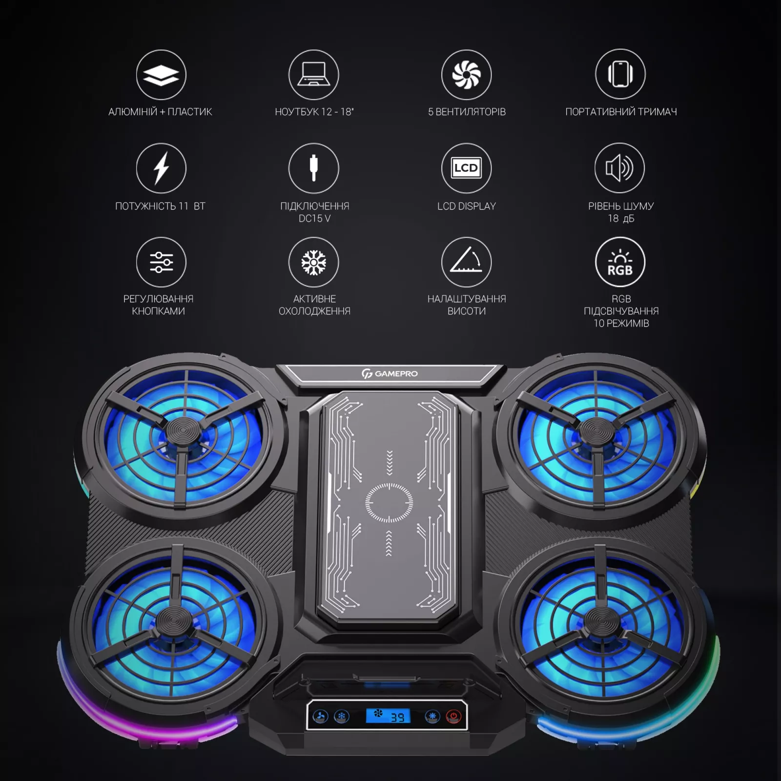 Благодаря четырем большим вентиляторам размером 100х100х16 мм и одному компактному вентилятору размером 8 , GamePro CP1450 создает мощный поток воздуха, обеспечивая эффективное охлаждение вашего ноутбука.