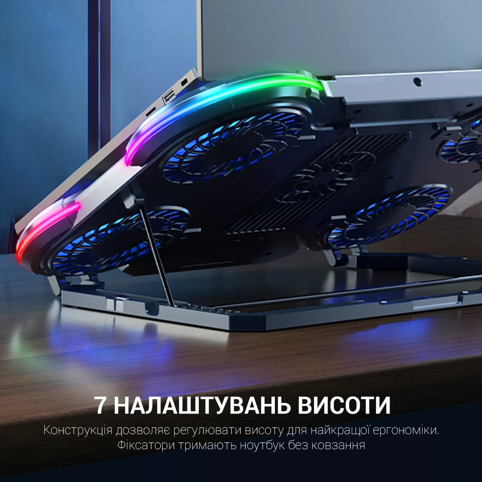 Подставка также предлагает 7 различных настроек высоты, чтобы найти оптимальный угол для работы или игры. Удобный LCD-дисплей показывает текущие параметры работы системы охлаждения, а держатель для смартфона позволяет вам удобно разместить ваше мобильное устройство рядом с ноутбуком. рабочего окружения.