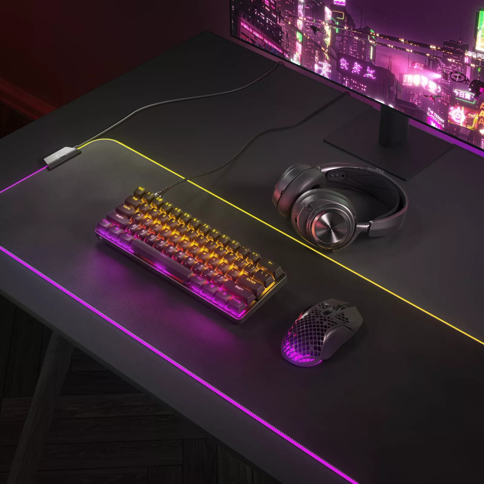 Перемыкание точки срабатывания клавиш с игровой 1 мм на более продуманную 1,5 мм. игр и большего места на рабочем столе для движений мышь. Алюминиевая верхняя пластина 5000 серии, идентичная металлу боевых самолетов, повышает и долговечность конструкции. APEX 9 MINI Работает на скорости света.