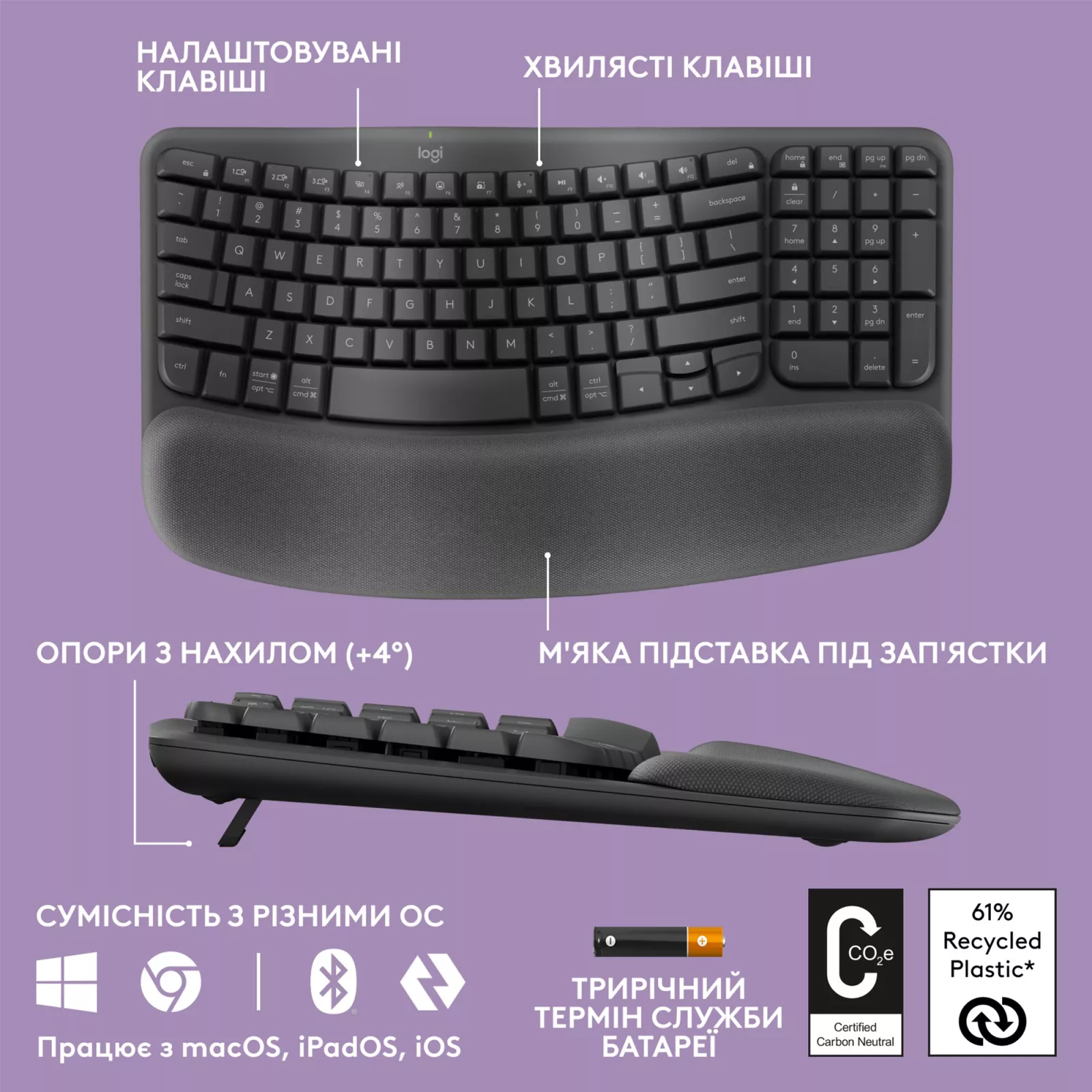 Дизайн этой компактной клавиатуры волнистой формы ставит руки, запястья и предплечья в естественную осанку для вашего комфорта в течение всего дня.