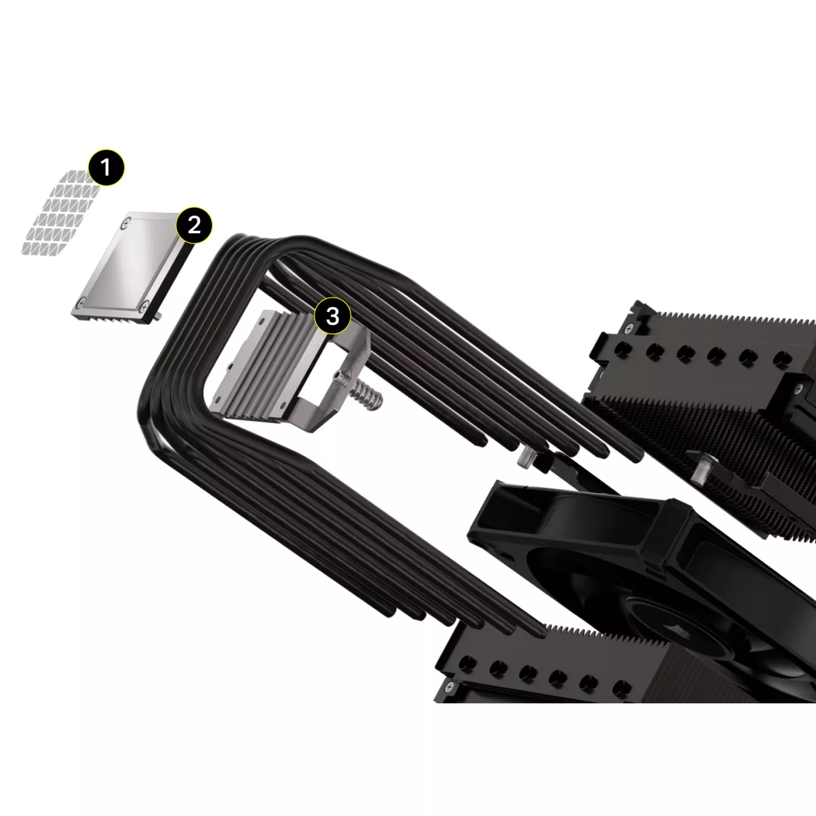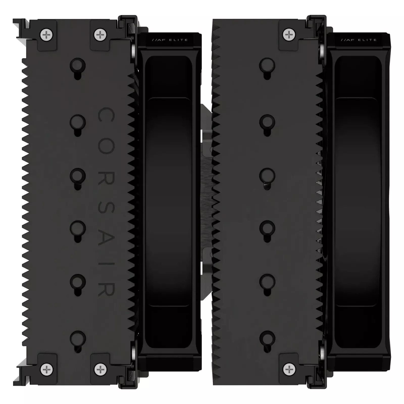 Два высокопроизводительных 140-мм вентилятора AF140 Elite с технологией Corsair AirGuide используют антивихревые лопасти для направления воздушного потока в концентрированную струю, обеспечивая более равномерный воздушный поток стеком ребер и поддерживая общий воздушный поток корпуса.