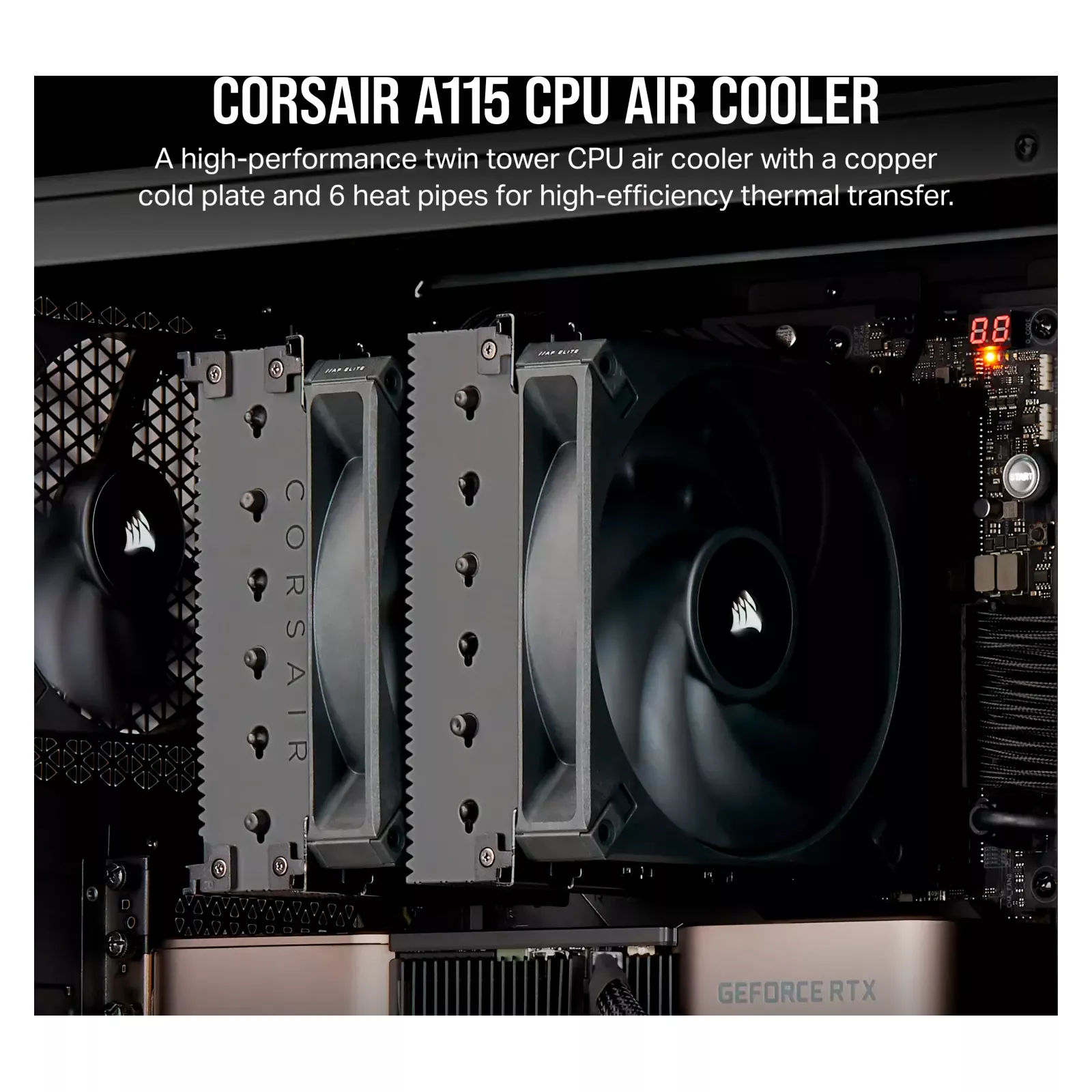 A115 Twin Tower CPU Air Cooler - высокопроизводительный воздушный кулер с шестью 6-мм тепловыми трубками и медной холодной пластиной для высокоэффективного теплообмена, в сочетании с системой крепления вентилятора с переменным скольжением и фиксацией и концентрированными вентиляторами с высоким воздушным потоком.