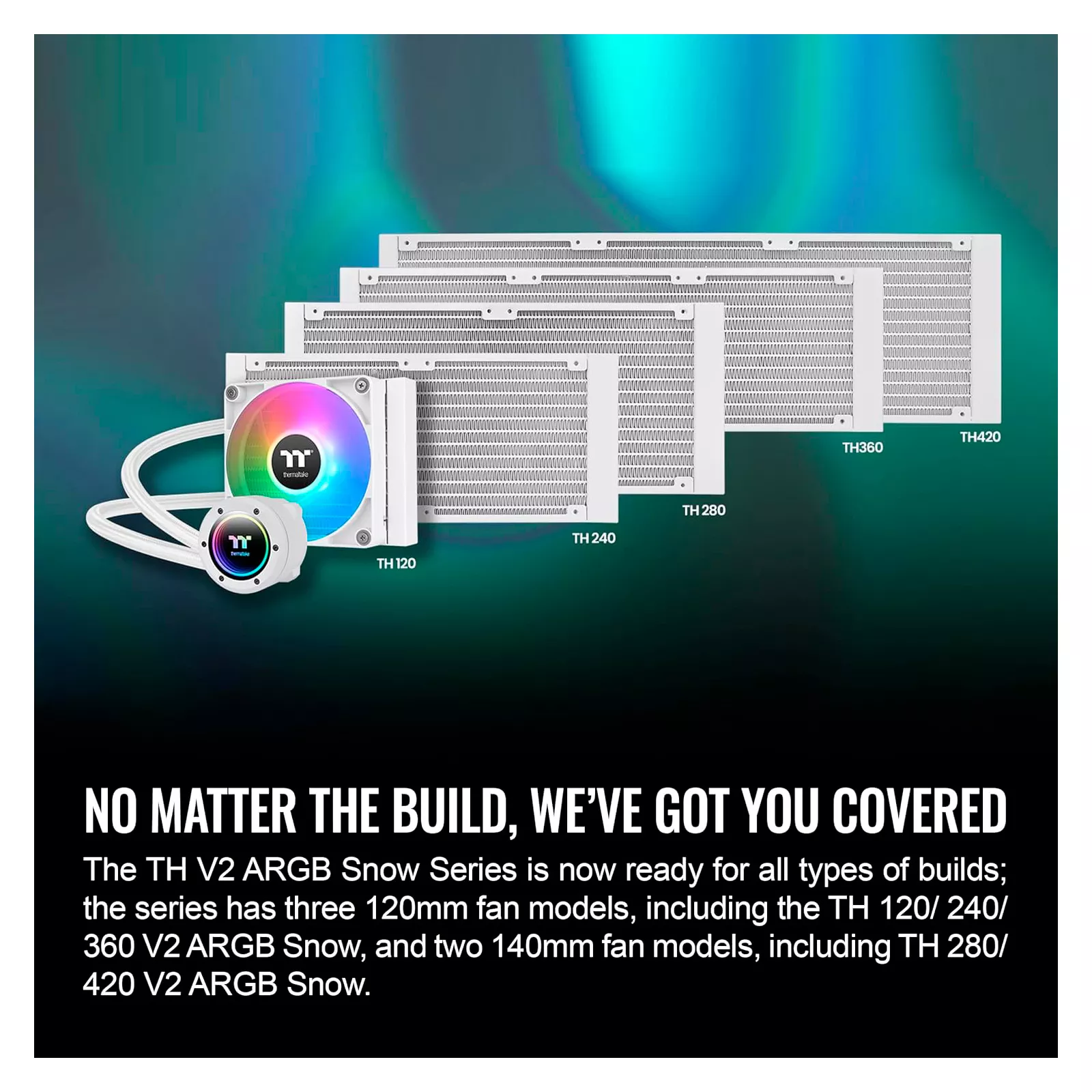Независимо от сборкиСерия TH V2 ARGB Snow теперь готова для всех типов сборок, в серии есть три модели со 120-мм вентиляторами, включая TH 120/240/360 V2 ARGB Snow, и две модели со 140-мм вентиляторами, включая TH 280/420 V2 ARGB Snow.