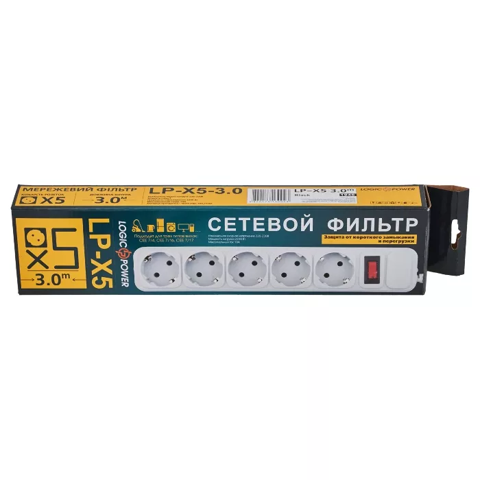 Сетевой фильтр LogicPower LP-X5, 3.0 m (1946) защищает все подключенные при его помощи устройства от помех электросети, перегрузок и токов короткого замыкания, которые часто возникают в современных реалиях и грозят устройствам сильными поломками и утратой работоспособности. Простое на вид устройство выполнено из серого пластика, который отличается не только экологичностью, но также температуро-стойкостью негорючими свойствами.