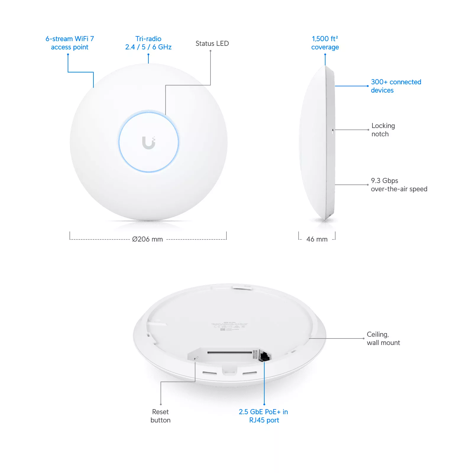 UniFi U7 Pro — передовая точка доступа WiFi 7, обеспечивающая высокоскоростной беспроводной доступ в больших и требовательных средах. С поддержкой новейшего стандарта WiFi 7 и 6 ГГц, U7 Pro предлагает невероятную скорость передачи данных до 9.3 Гбит/с и широкое покрытие до 140 м². Это идеальное решение для сред с высокой плотностью подключений, поддерживающей более 300 устройств.