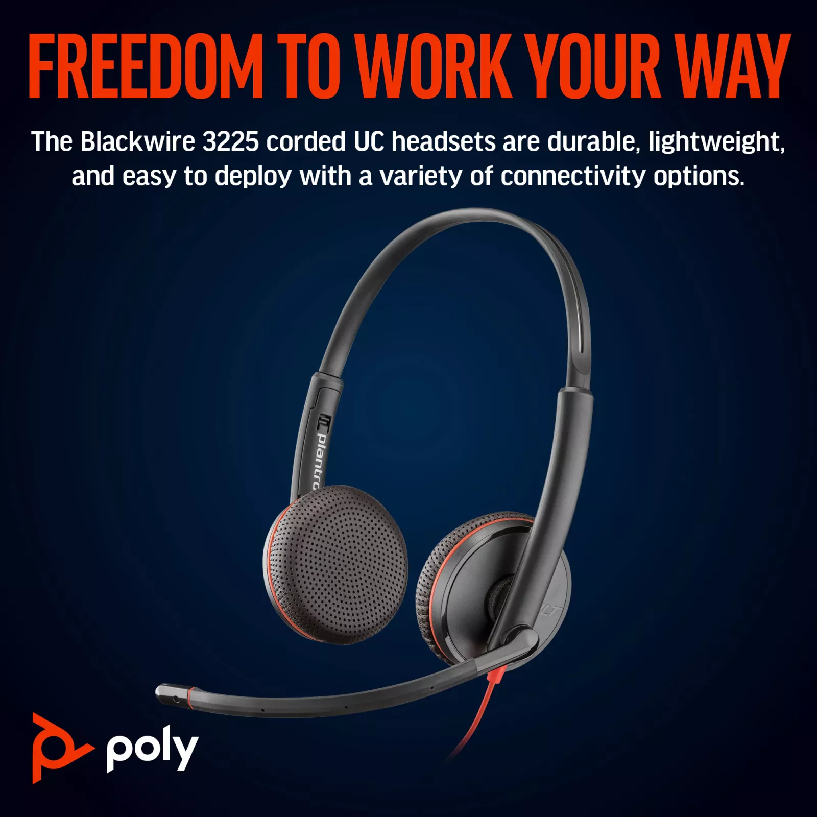 Гарнитура Poly BlackWire C3225 (80S11AA) - аксессуар премиумкласса, предназначенный для продуктивной работы в гибридных рабочих средах, прослушивания любимой музыки и общения без помех. Она подарит звук Hi-Fi качества. Мягкие амбушюры из экокожи и легкое металлическое обнажение обеспечивают комфорт при ношении в течение целого дня..