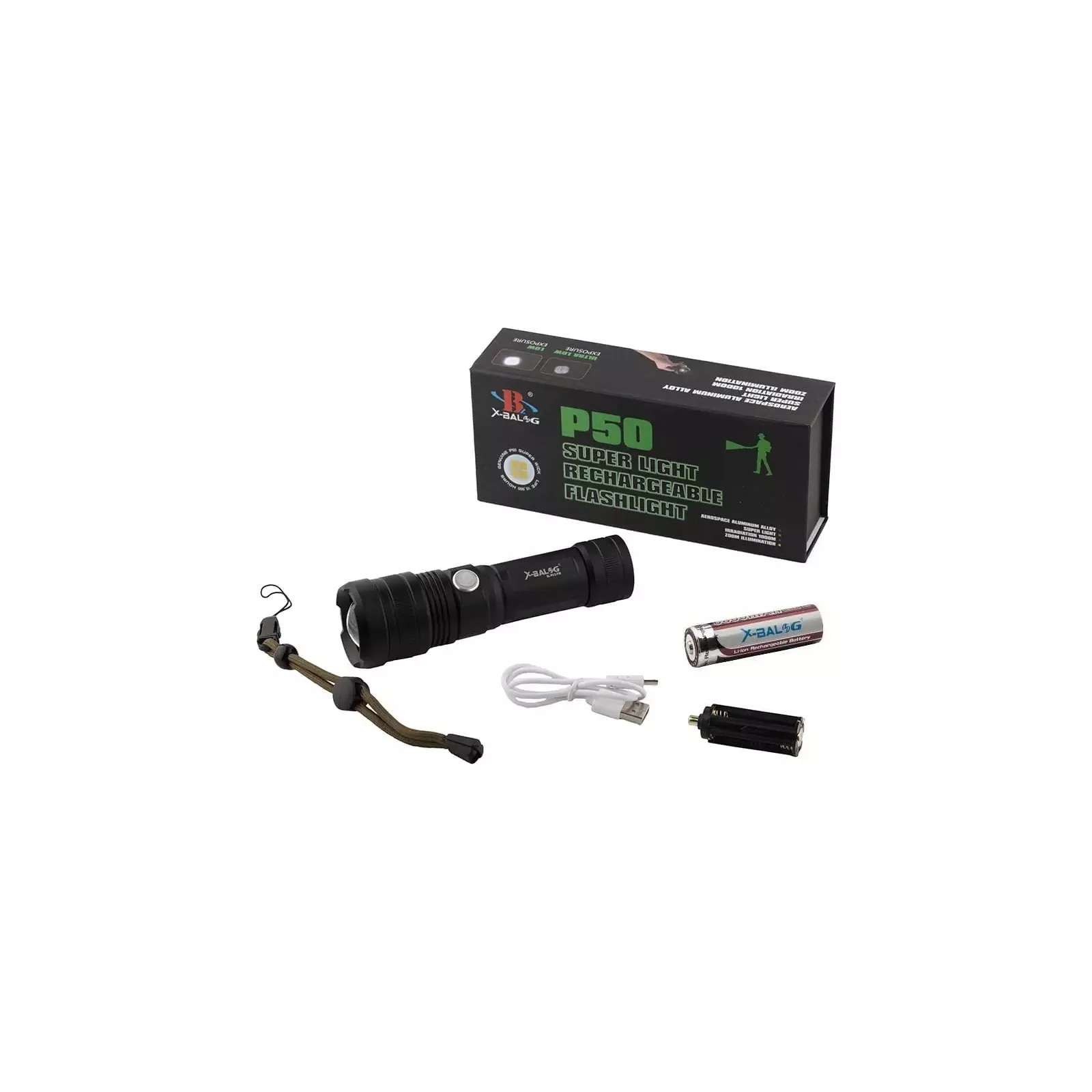 В комплект входят: фонарик X-BALOG BL-P512-P50 L-070, 1 батарейка 18650, зарядное устройство USB, корзина для батареек типа ААА, шнурок и оригинальная коробка.