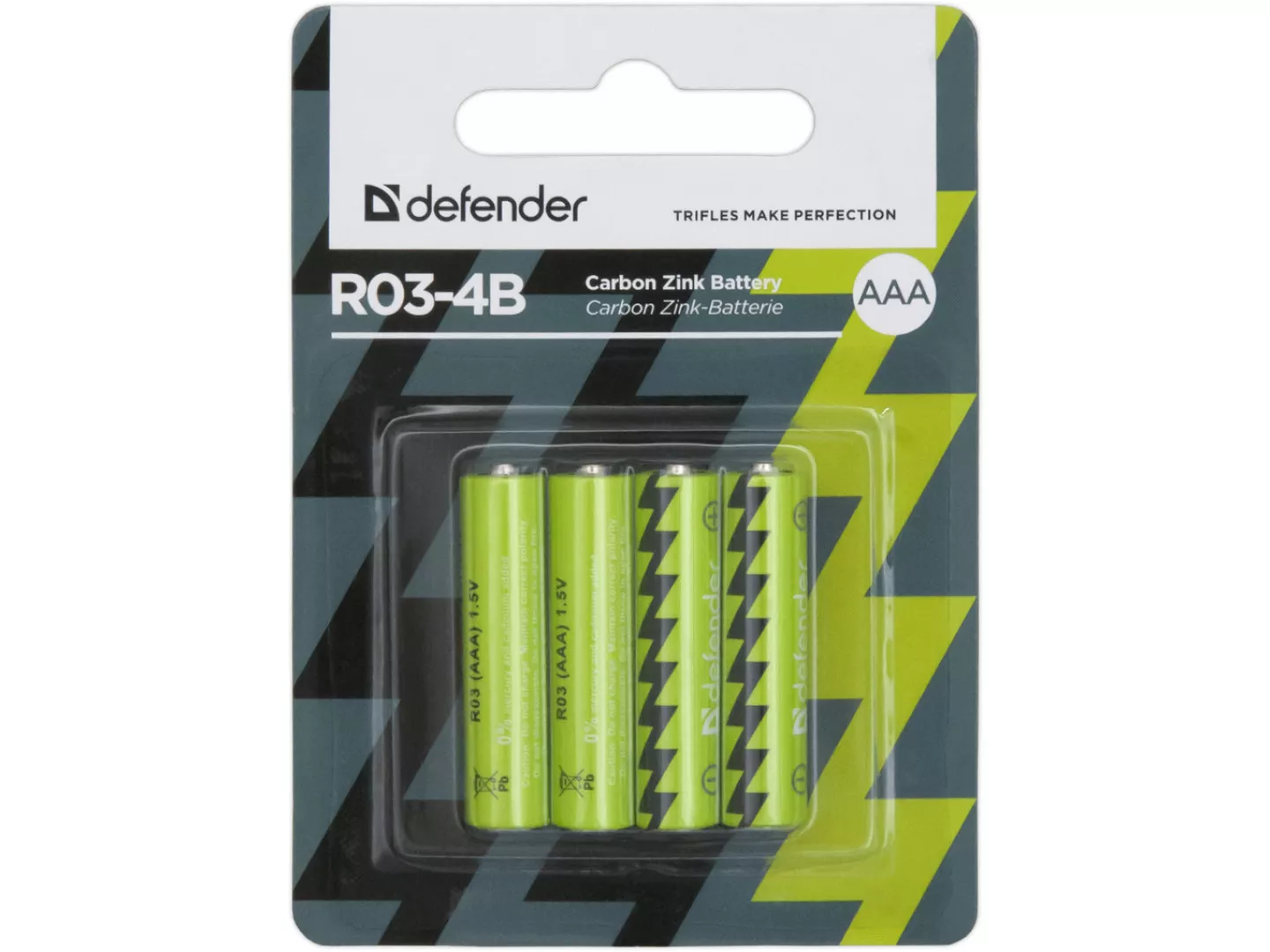 Типоразмер ААA (R03, LR03, FR03, HR03, ZR03), Количество в упаковке 4 шт, электрохимическая система Carbon Zink, Форма цилиндрическая, Напряжение 1.5 В,