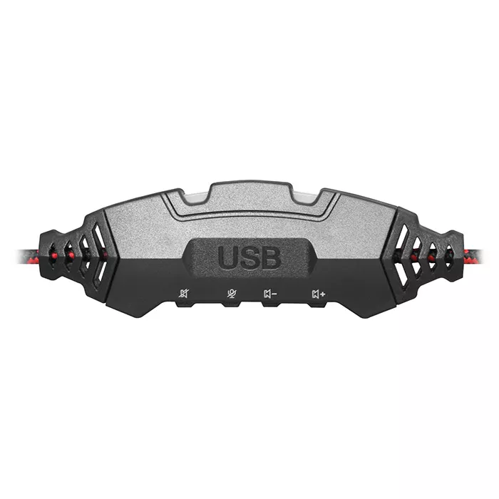 тип устройства - гарнитура, Тип - геймерские (игровые), подключение - проводное, конструкция - полноразмерные, тип крепления - дуга над головой, интерфейс подключения - USB, сопротивление наушников - 32 Ом, минимальная воспроизводимая частота - 20 Гц, максимальная воспроизводимая частота - 20 кГц, чувствительность - 115 дБ, цвет - Red, Black