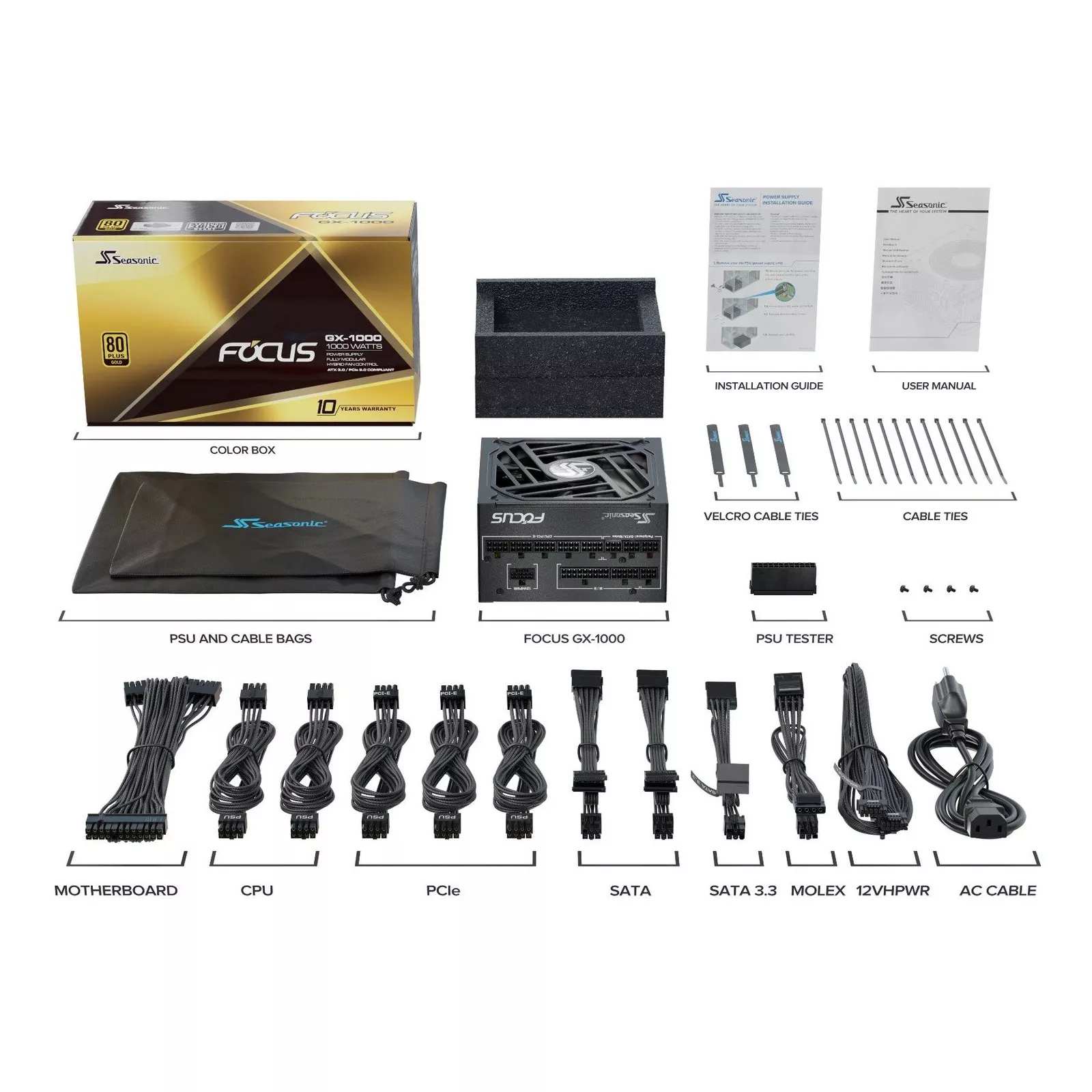 Seasonic 1000W Focus GX-1000 — блок питания от компании Seasonic. Изготовлен в формфакторе ATX 3.0 и обладает мощностью 1000 Вт, чего хватит для системы ПК продвинутого уровня. Такой элемент питания можно подобрать для офисных компьютеров и домашних систем.
