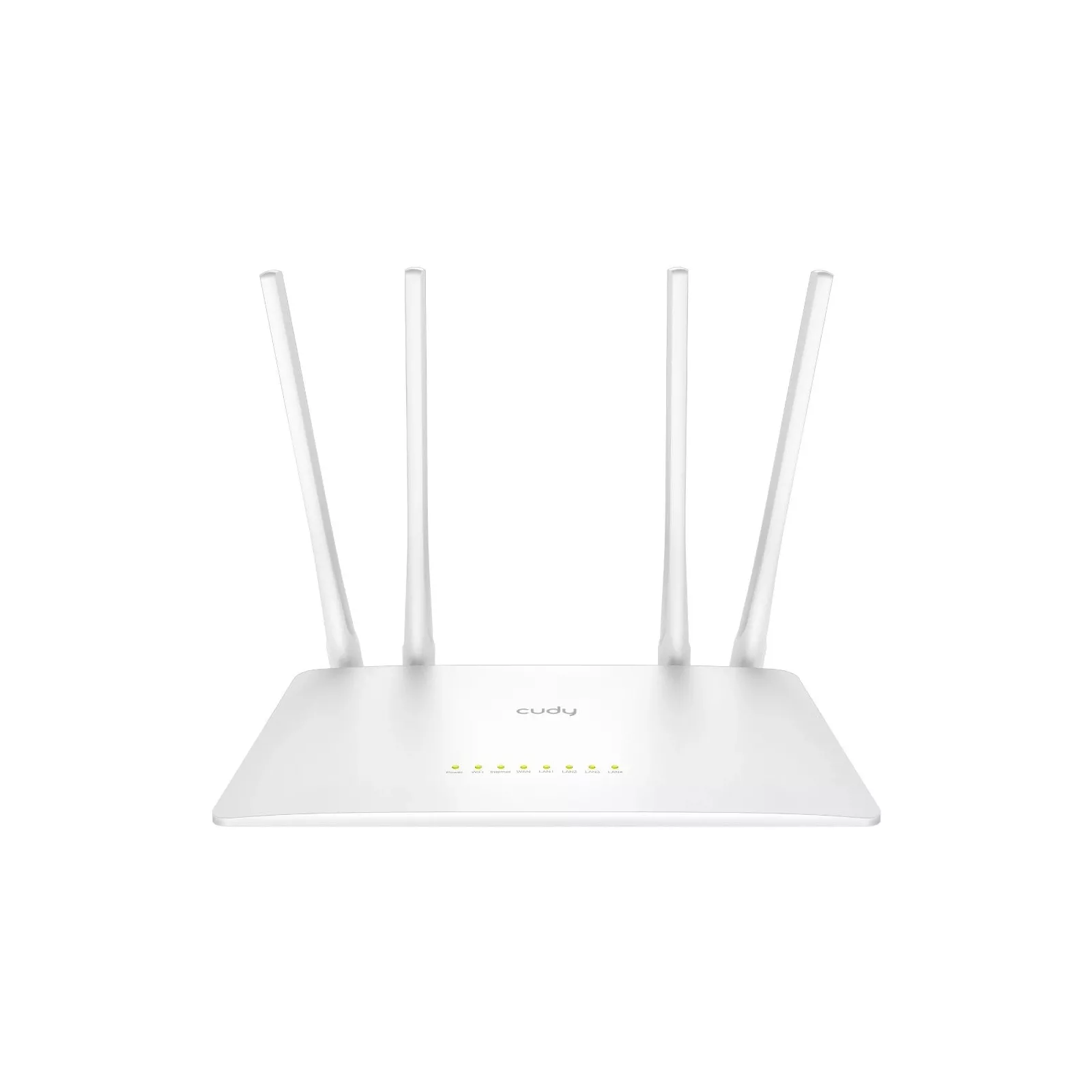 Двухапазонный WiFi 5 маршрутизатор Cudy WR1200. Скорость передачи 867 Мбит/с на 5 ГГц + 300 Мбит/с на 2.4 ГГц, стандарт WiFi 802.11ac/a/b/g/n, 5 портов Ethernet 10/100 Мбит/с, 4 внешних антенны 5dBi. Доступная ширина канала: 20/40 МГц.