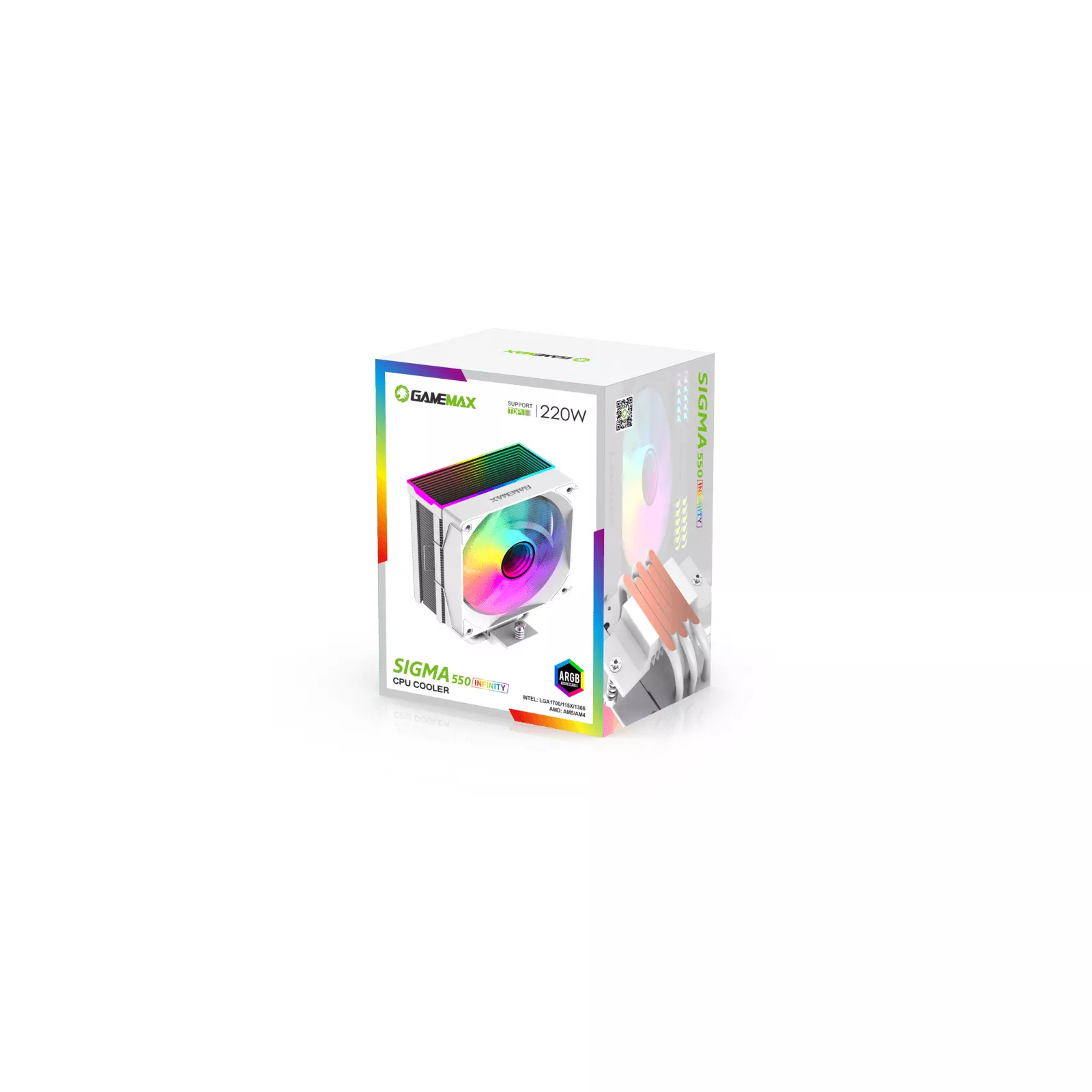 Кулер для корпуса GAMEMAX Sigma 550 Infinity WH, окрашенный в белый цвет имеет пять тепловых трубок. Он поддерживает процессоры Intel Gen12, 13 и последнюю модель AMD, а также оснащен и укомплектован световыми эффектами ARGB. Максимальная тепловая мощность процессора, с которой должна справиться система охлаждения - 220 Вт.