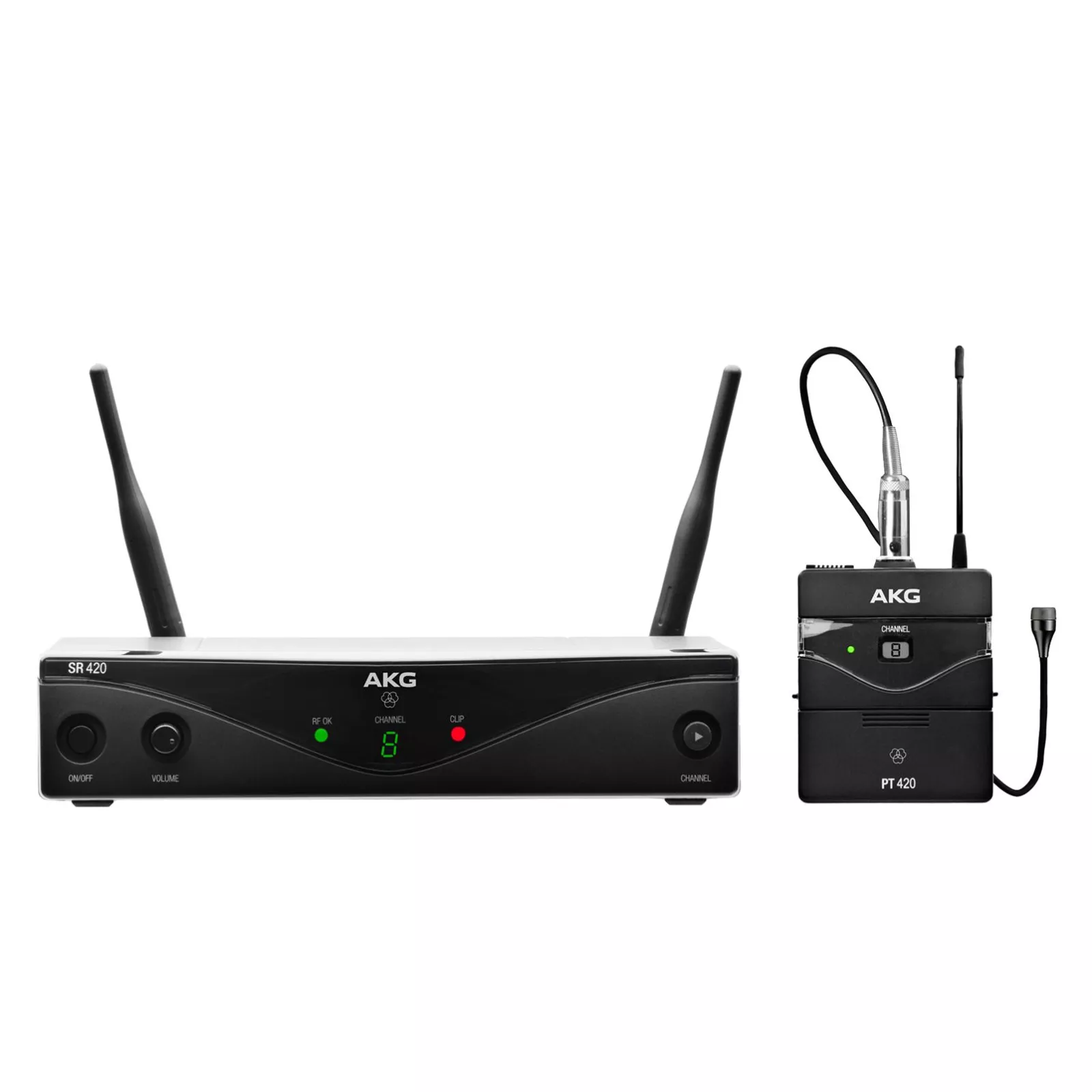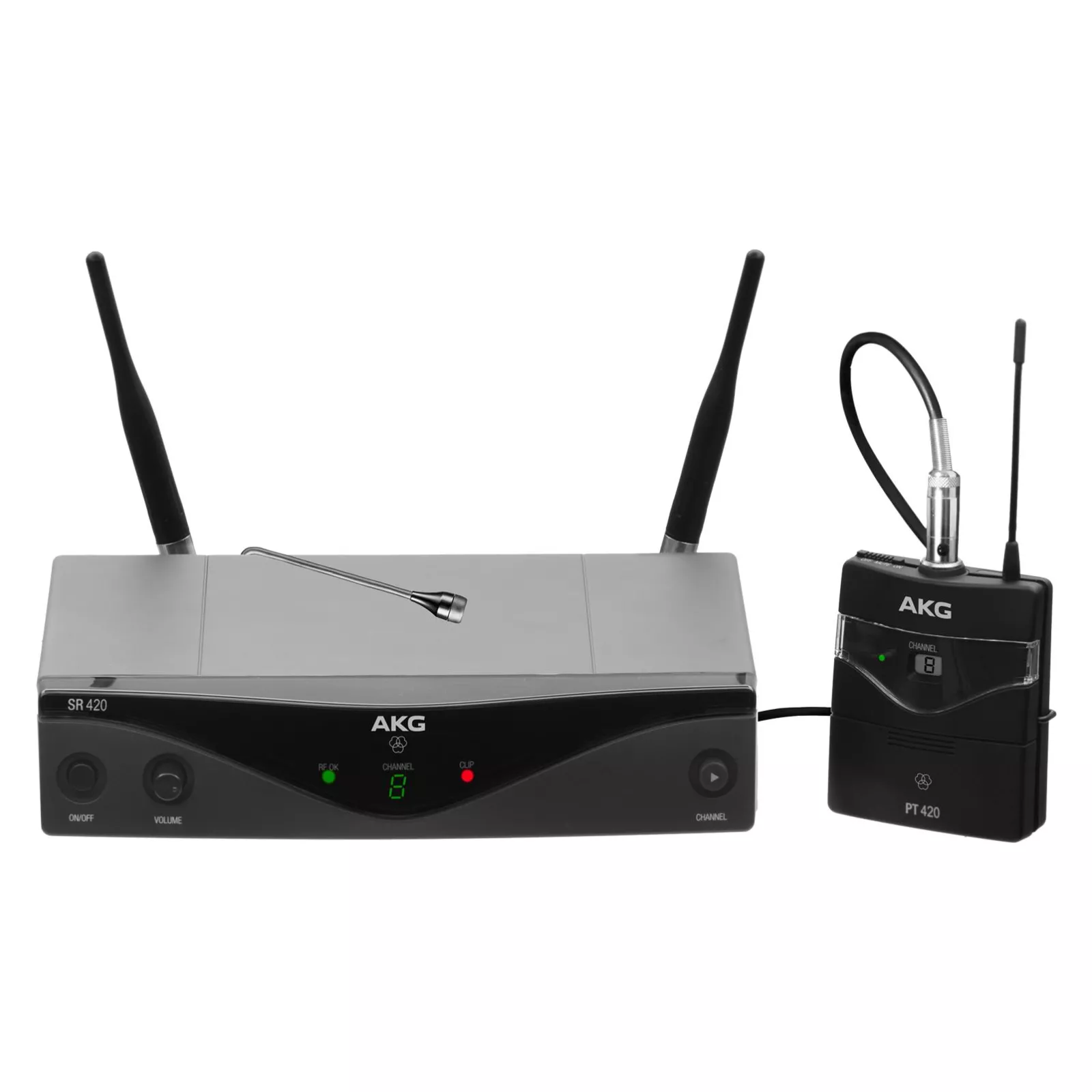 AKG WMS420 Presenter Set Band B1 - радиосистема с приемником SR420, портативным передатчиком PT420 и петличным микрофоном C417L. PT420 – аналоговый беспроводной поясной передатчик в маленьком, но крепком корпусе. Он разработан для уличного применения, на маленьких сценах и конференц-залах. PT420 оборудован регулятором gain для идеальной настройки громкости и бесшумным переключателем on/off/mute. Светодиодный индикатор статуса батарейки в случае разряженной батарейки загорается красным, что удобно контролировать время своего выступления. C417 L - профессиональный петличный микрофон с всенаправленной диаграммой направленности. Благодаря широкополосному воспроизведению звука этот микрофон идеален для всех типов языковых и театральных применений. Звук чрезвычайно открытый и естественный, а поскольку микрофон очень маленький, его можно незаметно прикрепить на пиджак, зажим входит в комплект.