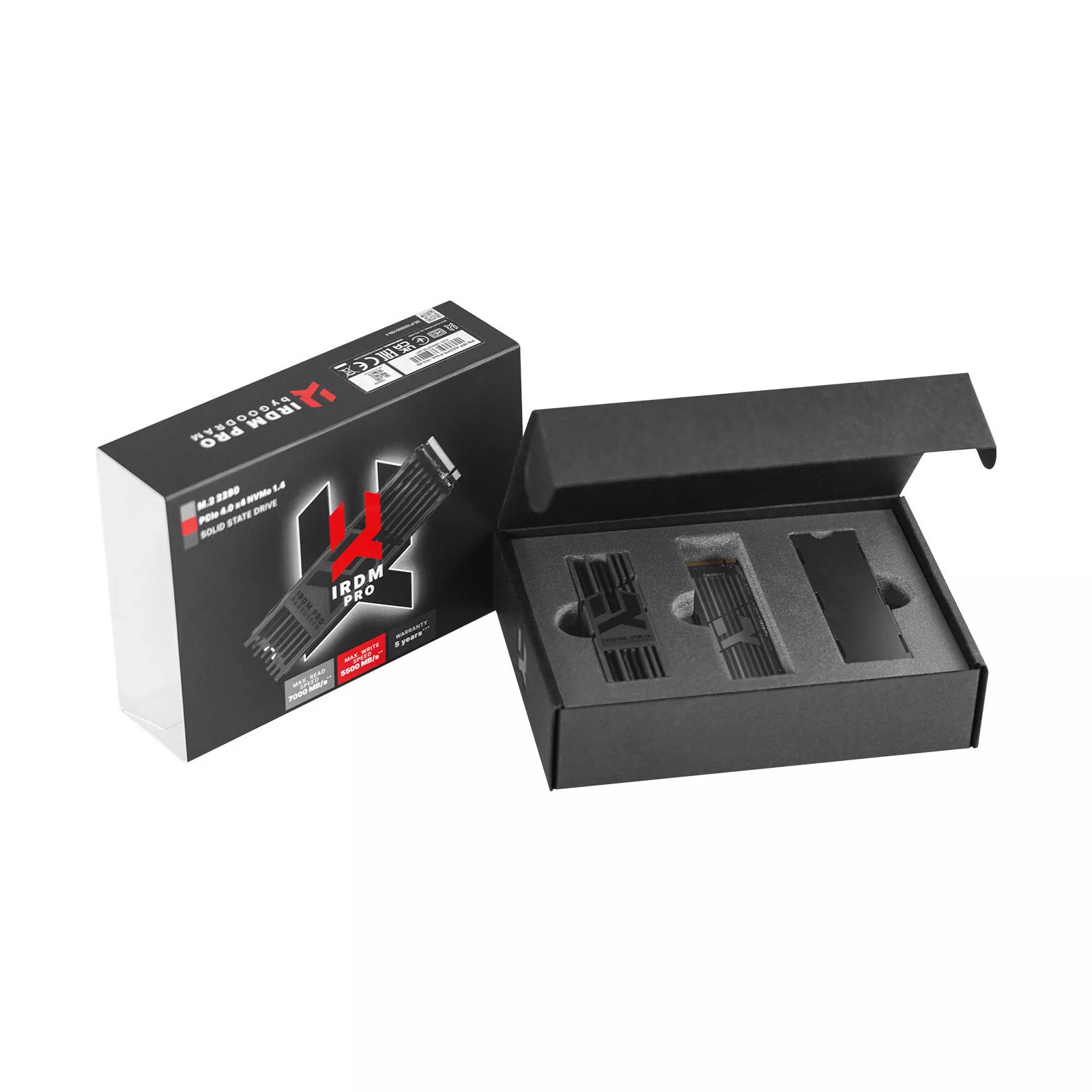Диск отличается не только технологией , но и по форме. Радиатор уникального дизайна – оригинальный проект польского бренда. Изготовлен из прочного материала, имеет эстетичный вид и дизайн, отражающий ценности бренда IRDM. С первого взгляда видно, что бренд работает на сплоченность своей продукции. Радиатор, сочетающий матовые и глянцевые отделочные элементы, выглядит массивно и дополнительно подчеркивает высокое качество всего устройства. Сохранение черного цвета относится к другим продуктам линейки IRDM, а вся структура поддерживает современный ретро-стиль, отсылающий дизайн электроники 80-х годов. Радиатор выполнен из теплопроводного алюминия. SSD IRDM PRO M.2 продается в упаковке, посвященной премиальному сегменту бренда IRDM. В середине упаковки изготовитель поместил диск, отдельный радиатор и монтажный комплект, состоящий из пластины, винтов и небольшой отвертки.