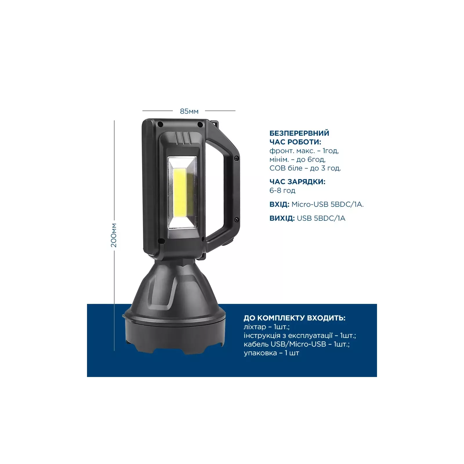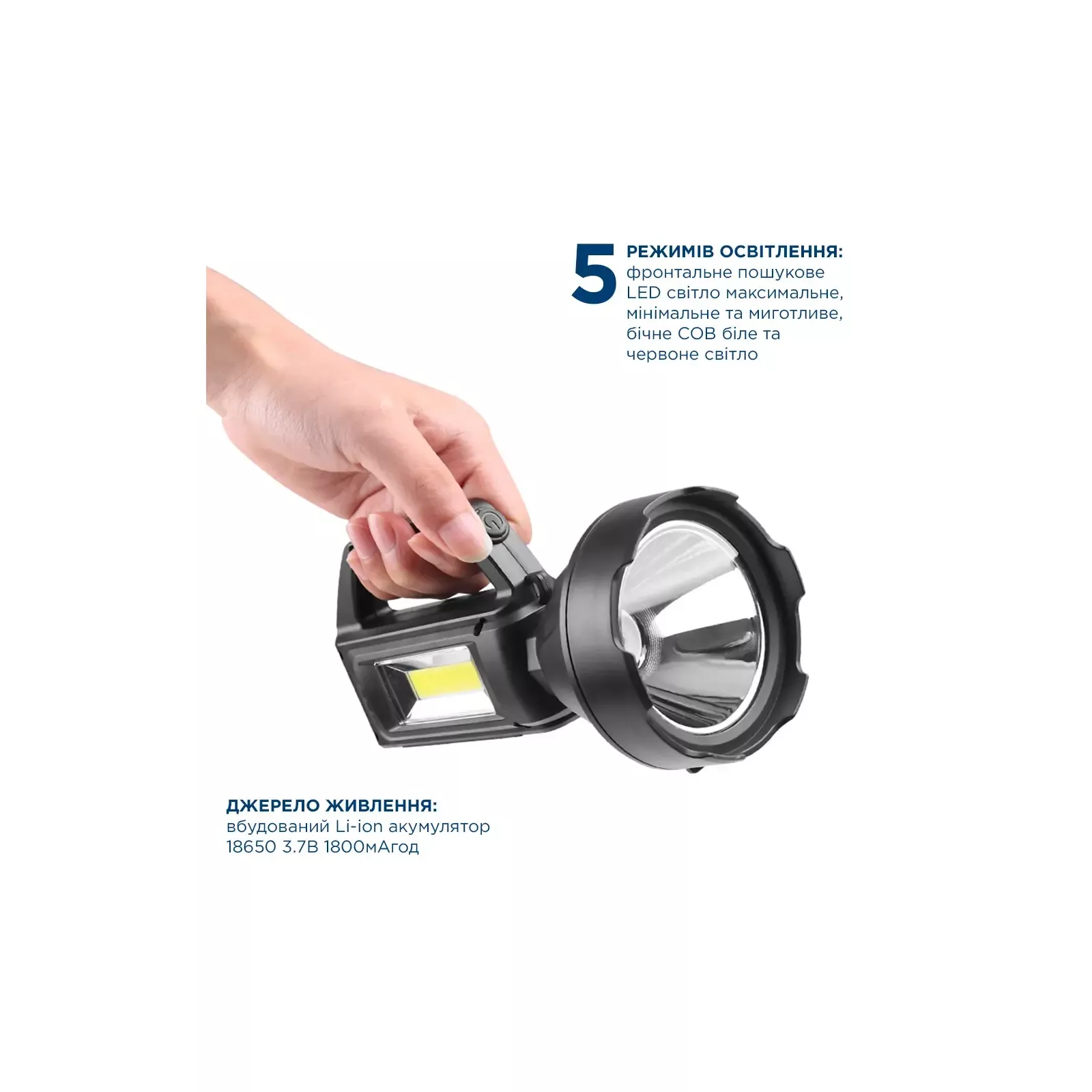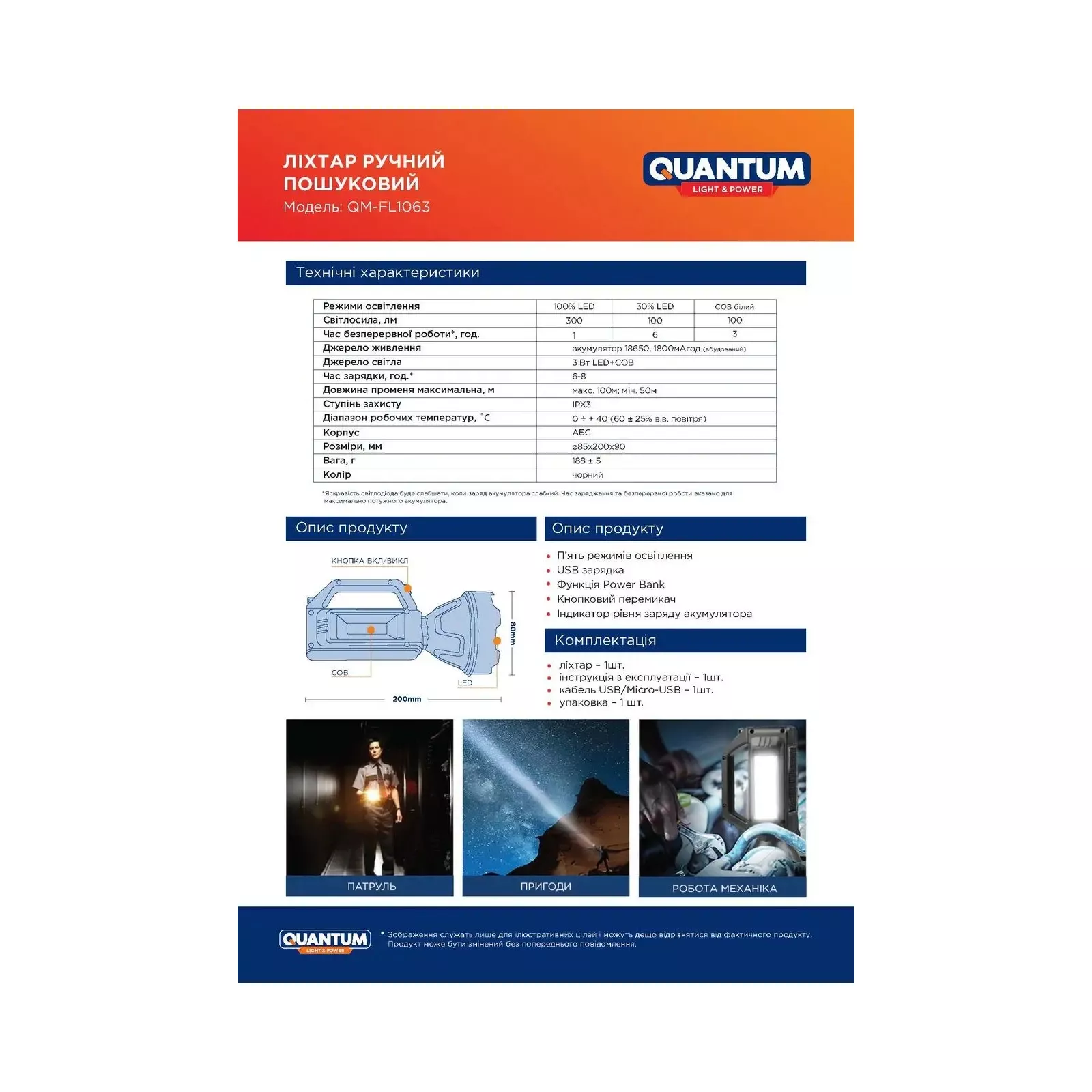 Фонарь ручной поисковый QM-FL1063 Tracker - это идеальный выбор для ремонтных работ, кемпинга, рыболовства, охоты и других видов активного отдыха. Материал корпуса АБС пластик. Один LED и один COB светодиоды очень эффективны и долговечны. Пять режимов освещения: фронтальный поисковый LED свет максимальный, минимальный и мигающий, боковой COB белый и красный свет. Режимы изменяются последовательно кнопкой выключателя, находящейся на передней части ручки фонаря. Поисковый фонарь обладает высокой яркостью и равномерным световым пятном. Боковой фонарь выполняет функцию светильника. Изделие оснащено и укомплектовано встроенным литий-ионным 18650. Фонарь Tracker может использоваться в качестве портативного зарядного устройства через порт USB, обеспечивая дополнительный источник энергии во время неотложных ситуаций. Индикация уровня заряда встроенного аккумулятора, включаемого с освещением, позволяет контролировать процесс зарядки и разрядки: светодиоды мигают во время заряда и светят при полном заряде. Каждый светодиод сигнализирует в процентном состоянии степень заряда – 25%, 50%, 75%, 100%. Порт Micro USB позволяет заряжать аккумулятор и быть фонарю всегда готовым к использованию. Благодаря защите от перезарядки и переразрядки аккумулятора, будет обеспечено долговременное его использование в безопасном режиме. соответствующий индикатор зарядки начнет мигать. Когда все индикаторы постоянно горят – заряд завершен. Фонарь нельзя использовать при зарядке. Изделие полностью заряжается примерно за 8 часов.