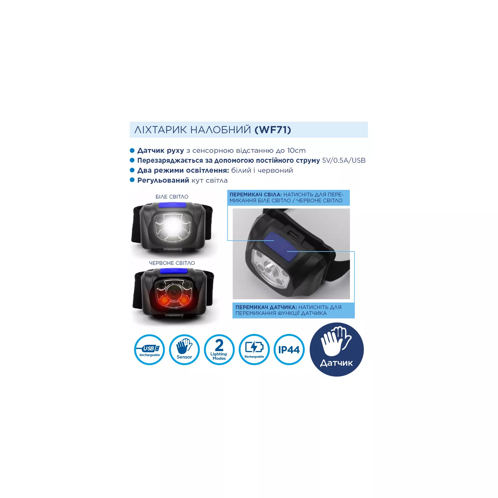Налобный фонарь WF71 Кнопочный переключатель и переключатель датчика (индикатор) расположены в верхней части фонаря. Правый кнопочный переключатель управляет включением света. Нажмите переключатель, чтобы включить белый свет, нажмите еще раз, чтобы переключить режимы освещения из белого на красный свет. Левый переключатель датчика (индикатор)а управляет функцией включения датчика (индикатор)а. Нажмите переключатель для переключения функции датчика (индикатор), а красный индикатор датчика (индикатор) включится. В этом режиме можно махнуть рукой перед светом, чтобы вкл./выкл. белый свет. После использования нажмите переключатель, чтобы отключить функцию датчика (индикатор), а красный индикатор датчика (индикатор) и выключится соответственно. Порт для зарядки расположен в нижней части фонаря, индикатор зарядки находится возле зарядного порта. Фонарь имеет регулируемый угол освещения, что обеспечит Вам легкость в использовании и позволит работать с ним без привлечения рук. Прекрасная вещь для многих видов активного отдыха, таких как путешествия, пешие прогулки, езда на велосипеде, рыбалка и т.д. Более 135 лет инноваций в сфере электротехники – электротехнические инновации Westinghouse добавил в каждый портативный осветительный прибор. >