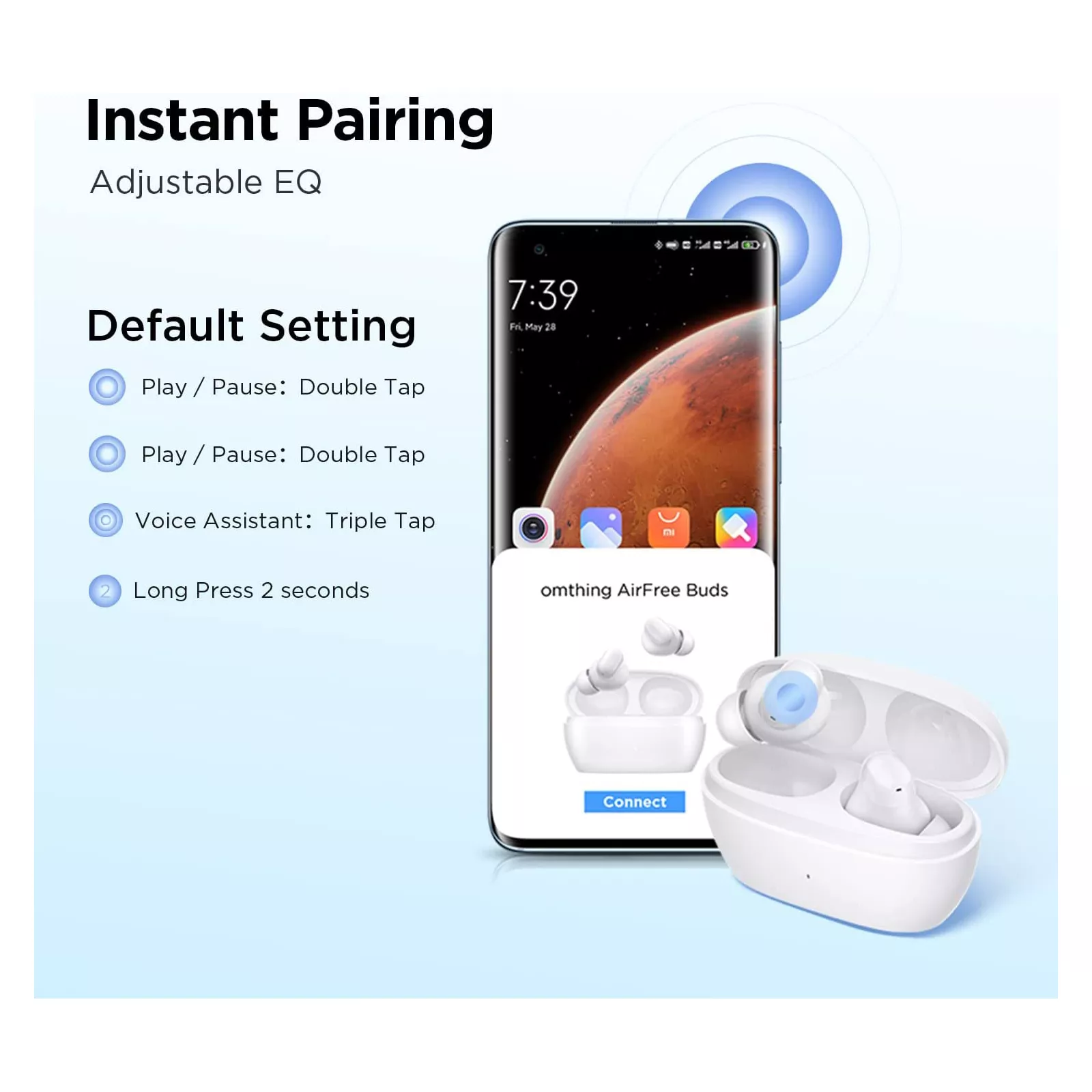 Беспроводные наушники Omthing AirFree с интеллектом дарят беспрецедентную свободу при прослушивании и общении, а также чистый мощный звук. Стандарт Bluetooth 5.3 обеспечивает надежное подключение и передачу сигнала без искажений и задержек. Общего заряда батареи и кейса хватит на целых 44 часа воспроизведения. Благодаря современному стандарту Bluetooth 5.3, вам гарантировано устойчивое соединение, отличное качество воспроизведения без задержек и искажений и низкое энергопотребление. Наушники звучат просто потрясающе, тратя гораздо меньше заряда. С Omthing AirFree музыка звучит гораздо дольше, чем вы могли себе представить. При полном заряде наушники работают до 7 часов, а с учетом заряда кейса вы можете смело рассчитывать на 44 часа улётной музыки. Миниатюрные наушники Omthing AirFree получили 8 мм динамические драйверы с профессиональными акустическими настройками, воспроизводящими сбалансированные, мощные и детализированные басы. Наслаждайтесь кристально чистым звуком, одетым в ультракомпактный корпус. В приложении на своем смартфоне вы сможете выбирать настройки эквалайзера и использовать 6 предустановленных режимов в зависимости от того, что вы слушаете. Теперь даже хорошо знакомые композиции зазвучат по-новому, с большей детализацией и глубиной. Благодаря усовершенствованным алгоритмам нейронной сети во время вызова происходит эффективное подавление внешних шумов и усиление звуков вашего голоса. Вы звучите чисто и четко даже в шумной городской обстановке, и ваш собеседник отлично слышит каждое слово как при живом общении. Облегченные наушники весом всего 4 г каждый идеально располагаются в ушах и обеспечивают комфортные ощущения даже при длительном использовании. Силиконовые вставки трех разных размеров плотно фиксируют наушники и предотвращают выпадение при резких движениях головой. В игровом режиме происходит сверхточная синхронизация звука и видео, снижается задержка и искажение звука. Благодаря этому вы получите по-настоящему иммерсивный игровой опыт и море ярких впечатлений от геймплея.
