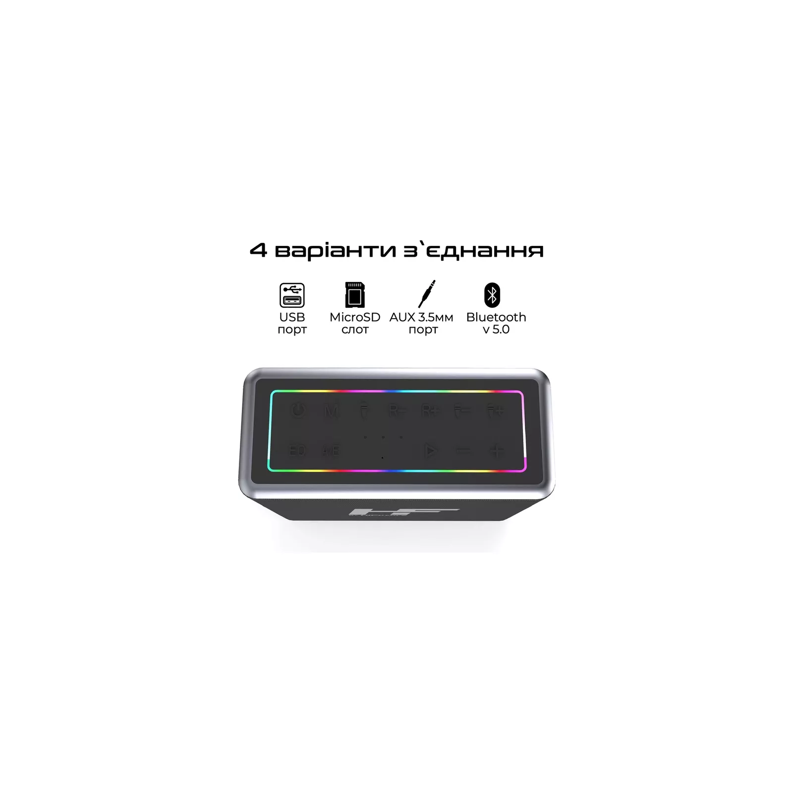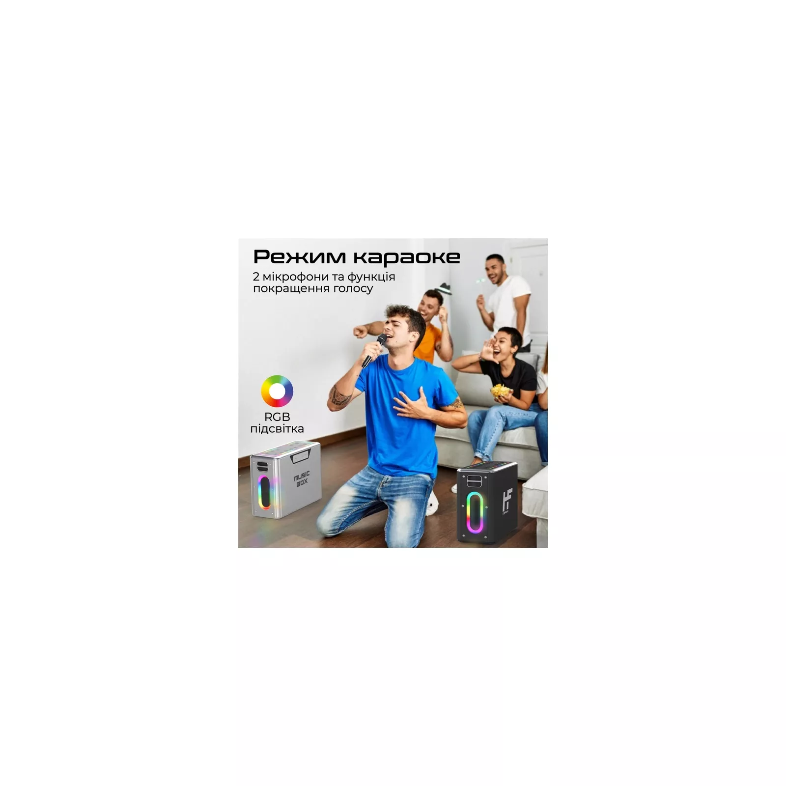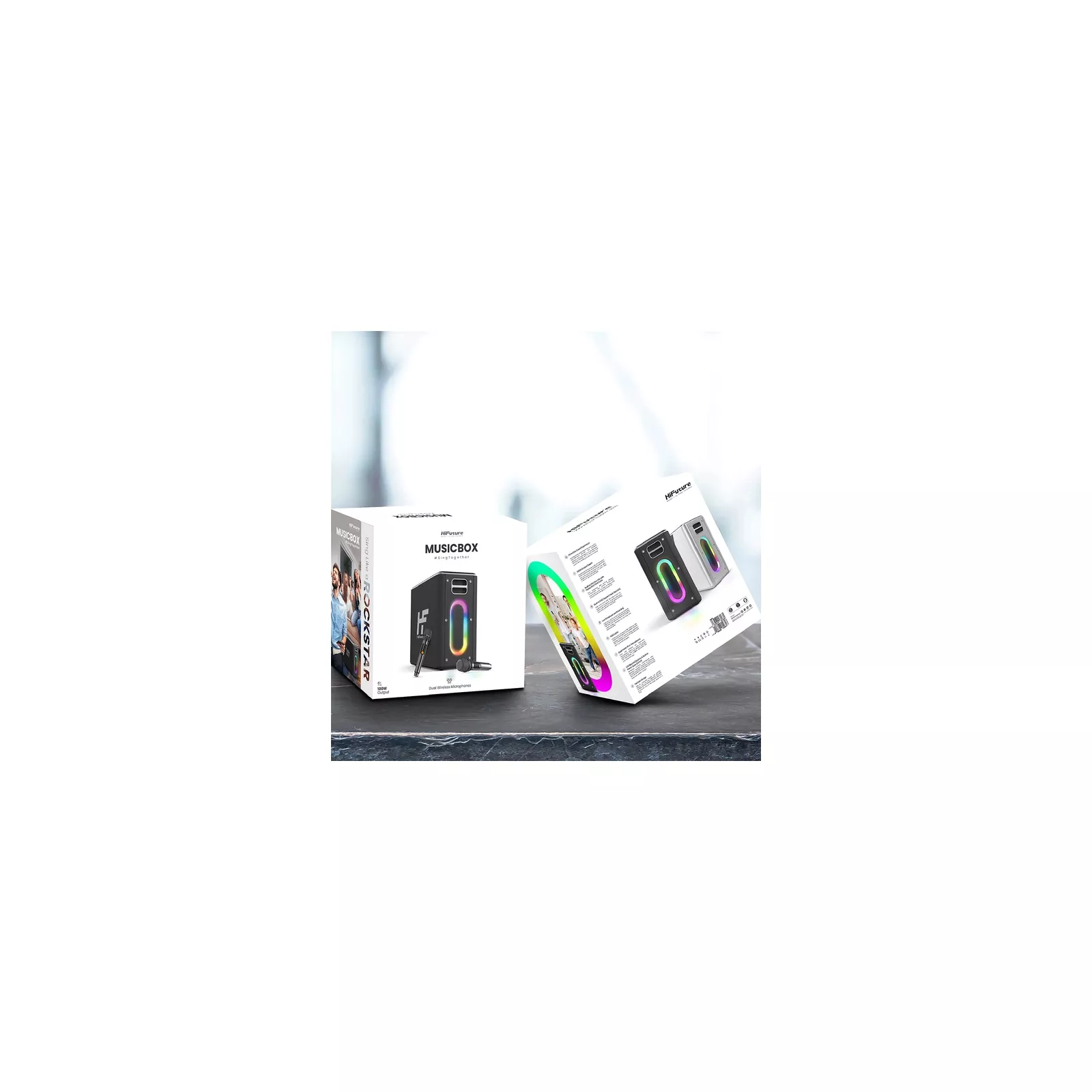 Четыре динамика суммарной мощностью 100W, система караоке с двумя микрофонами и динамической RGB-подсветкой. MusicBox от HiFuture - портативная колонка, созданная для крутых денс пати и вокальных батлов. Особенности: Объемный звук: Несмотря на небольшие габариты, MusicBox обладает удивительно мощным звучанием благодаря сочетанию двух сабвуферов по 30W и двух твиттеров по 20W.