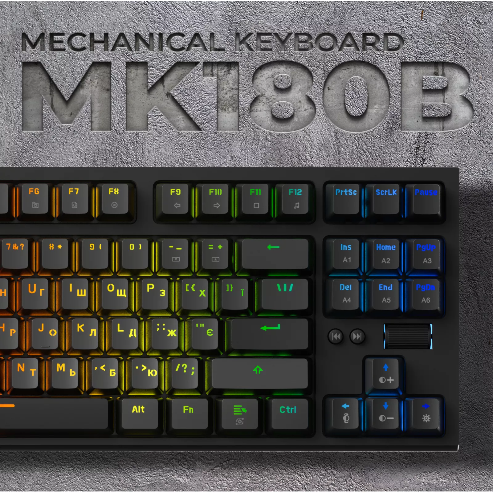 Механическая клавиатура MK180B – это настоящая находка для тех, кто ценит стиль и функциональность. Она имеет полноразмерный форм-фактор 95%, что означает наличие цифрового блока, в свою очередь придающего комфорт, и пользы при постоянной работе с цифрами. Ее элегантный корпус и кейкапы создают стильный вид, подчеркивающий вашу индивидуальность. Клавиатура имеет 87 клавиш и удобный регулятор громкости, что позволяет легко управлять звуком, а две дополнительные мультимедийные клавиши позволяют быстро и без труда переключаться между любимыми треками. Благодаря конструкции Gasket mount с двумя слоями пены EVA, поглощающими шум, нажатия клавиш становятся мягкими и имеют очень приятный звук при наборе текста. Механические переключатели типа outemu red являются линейными, что делает их идеальными для тихой работы . Кроме того, переключатели имеют ресурс до 50 миллионов нажатий, что делает срок их работы очень длительным. Одной из ключевых особенностей клавиатуры является Hot-Swap система, позволяющая легко изменять переключатели без необходимости пайки. Следующей особенностью MK180B является яркая RGB-подсветка, которую можно настроить в соответствии с вашими предпочтениями, выбирая из большого количества режимов, а также регулировать яркость и скорость эффектов подсветки.
