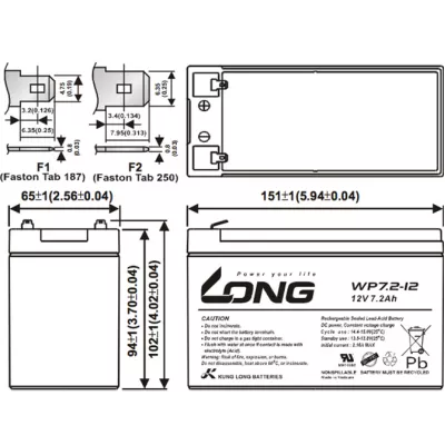 12 В, 7.2 Ач, Клеми - F1/F2, свинцово-кислотный, 151 х 65 х 94(102) мм, 2.35 кг