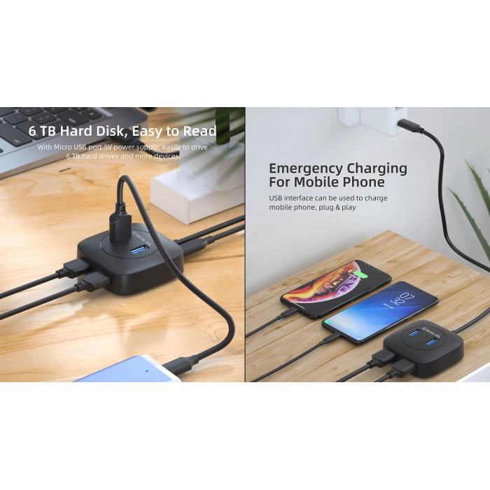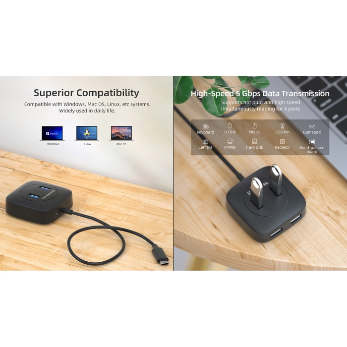 REAL-EL CQ-407 оснащен и укомплектован четырьмя портами USB 3.0, позволяющие подключать несколько устройств одновременно, обеспечивая скорость передачи данных до 5 Гбит/с. Подключение осуществляется с помощью разъема Type C, что делает его совместимым с современными устройствами. грамм делает этот концентратор идеальным для использования как дома, так и в офисе, как в кафе, так и на свежем воздухе.