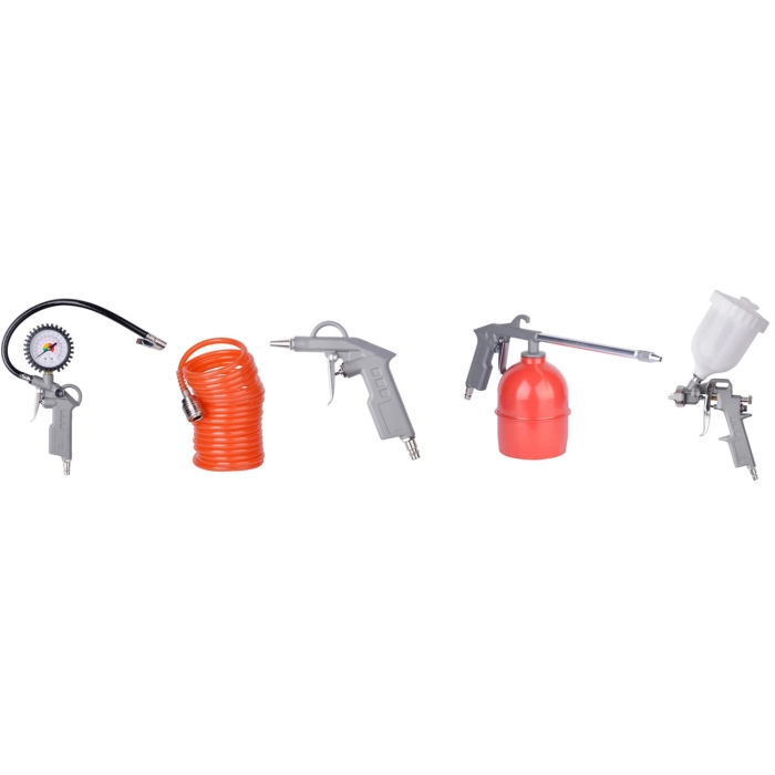 | Комплектация набора | краскопульт, пистолет продувной, пистолет с манометром, пистолет-распылитель, пневматический шланг |