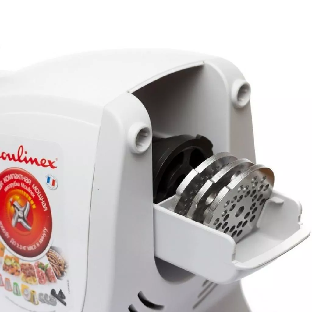 Выбирая качественный и многофункциональный прибор, следует обратить свое внимание на мясорубку MOULINEX ME 4421. Мясорубка обладает мощностью, 700 Вт, что обеспечивает эффективное измельчение продуктов. Модель имеет хорошую перемалывающую способность, её производительность составляет 2,3 кг/мин. В комплекте с прибором есть решетки и специальные насадки - насадка "кеббе", насадка для приготовления колбас, 2 перфорированного диска для фарша.