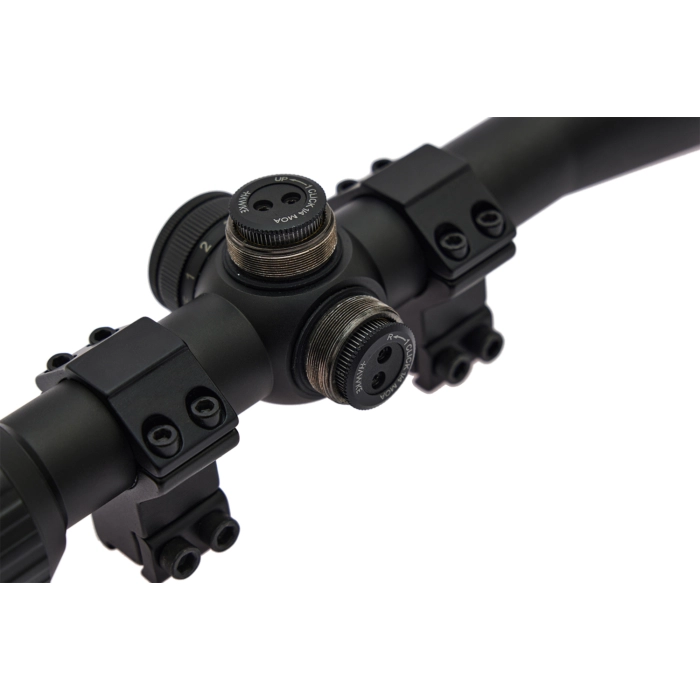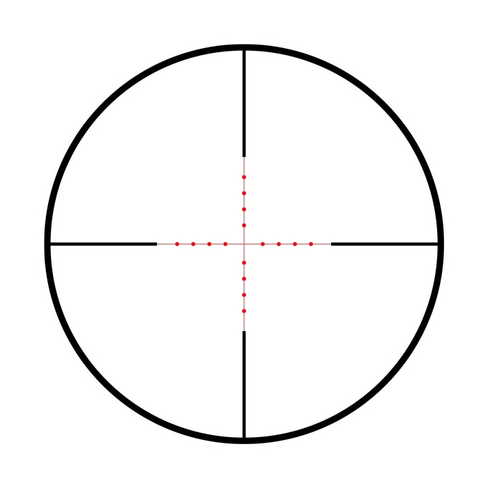 Прицельная сетка Mil -Dot выполнена в виде перекрестка с дополнительными точками и имеет подсветку красного или зеленого. цвета. Mil-Dot – это универсальная и очень популярная метка, которая подойдет для выстрелов по движущимся целям как на коротких расстояниях, так и на более средних дистанциях. Эффект паpaлаca регулируется от 9 метров и до бесконечности.