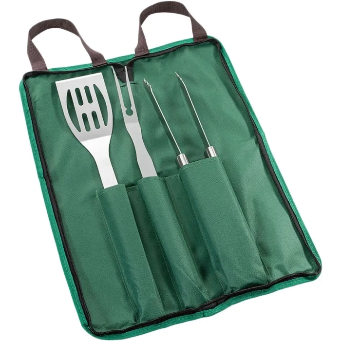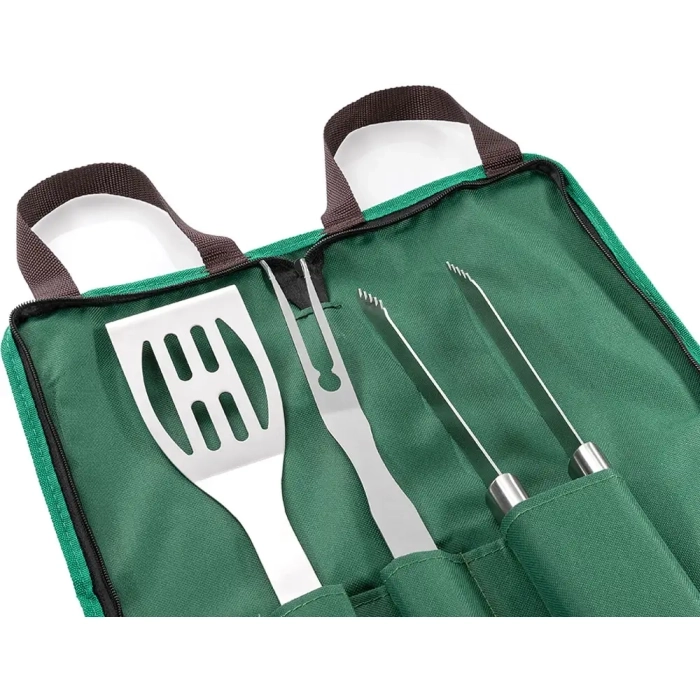 Набор содержит 3 самых популярных аксессуара для приготовления на гриле стейков, колбасок, овощей и блюд. лаваши: удобные щипцы, лопатка и вилка для мяса. Все инструменты сделаны из высококачественной нержавеющей стали толщиной 1.5 мм, что гарантирует их долговечную эксплуатацию. Набор состоит в компактный водонепроницаемый чехол с высокими износостойкими свойствами. Благодаря транспортировочной ручке его удобно хранить и брать с собой. Набор мобильный и практичный, не занимает много места, а благодаря своим компактным габаритам он легко поместится в обычный прогулочный рюкзак вместе с другими туристическими аксессуарами. гарантированно пригодится!