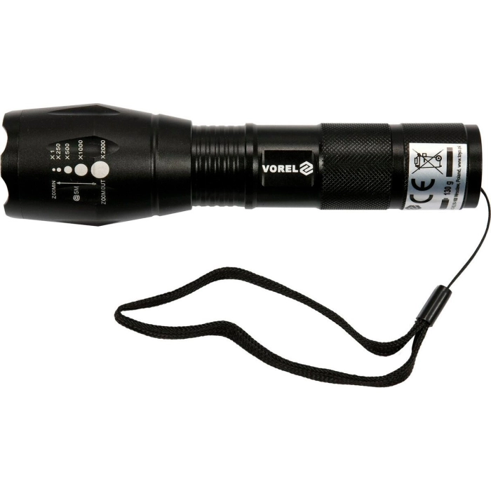 Бытовой фонарик Vorel на 5 Вт оснащен и укомплектован светодиодами Cree XP-E с 3 режимами свечения. Измеряется световой сгусток 280 лм. На алюминиевом корпусе находится прорезиненная кнопка-выключатель. Имеет настройку угла рассеяния. Работает от 3 батареек ААА по 1.5 В.