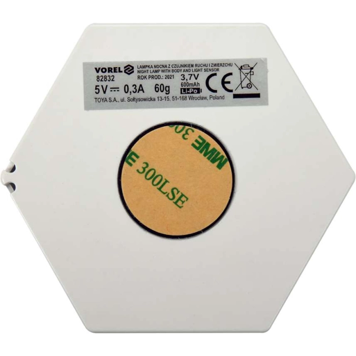 В качестве источника света установлены 6 SMD светодиодов, мощностью 1 Вт. В общем, они обеспечивают силу света в 50 лм. Аккумуляторная LED лампа-ночник с датчик (индикатор) движения 9х9х28 см VOREL имеет три режима работы: - ON (свет горит) - AUTO (свет выключен, работа после активации датчик (индикатор) а движения) - OFF (свет и датчик (индикатор) ) выключены) датчик (индикатор) движения обеспечивает включение светильника при обнаружении движения. датчик (индикатор) сумерек обеспечивает работу датчик (индикатор) движения только в темный период, вокруг себя. Благодаря этому лампа не горит, например, днем, и таким образом экономит батарею. 3.7 В